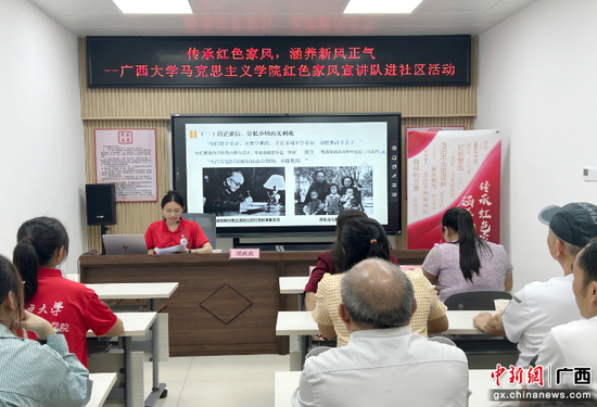为助力营造家庭文明新风尚,让红色家风在基层社区“生根发芽”,9月12日,beat365正版唯一官方网站学生红色家风宣讲队走进南宁市西耐路社区,开展以“传承红色家风,涵养新风正气”为主题的红色家风宣讲活动。西耐路社区党群服务中心工作人员和社区党员代表参加活动。