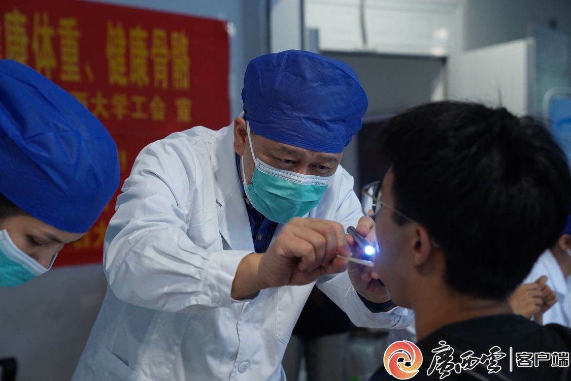 广西医科大学附属口腔医院院长廖红兵给beat365正版唯一官方网站师生进行口腔检查。