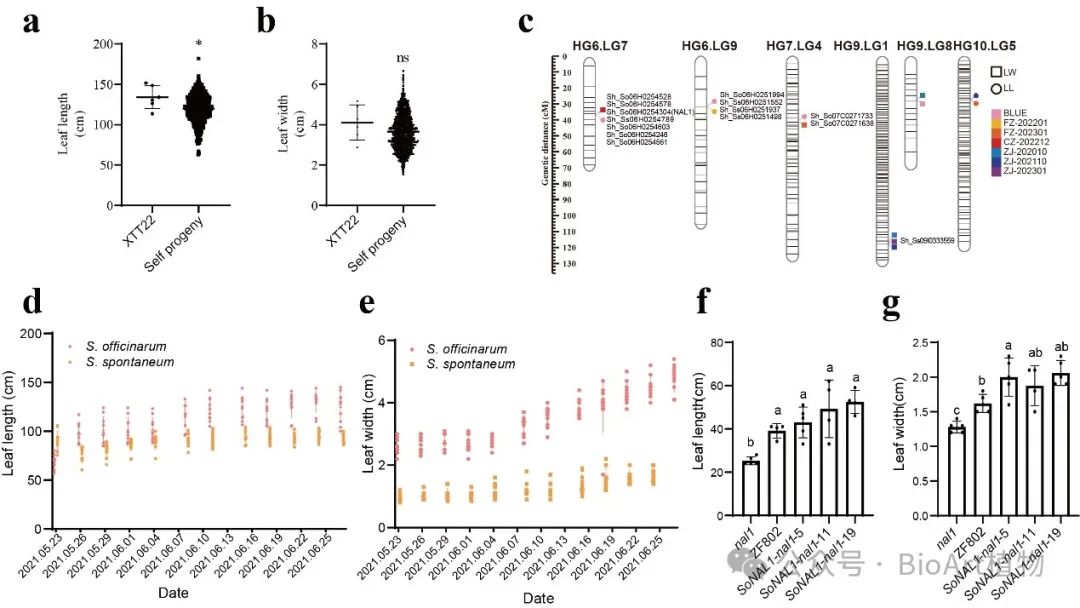 超亲分离广泛存在于多倍体植物中,为了解析甘蔗的超亲分离机制,研究团队聚焦于192份XTT22自交遗传群体,从控制植株结构和生长的叶片表型出发,通过大规模基因组重测序数据,构建了高密度遗传图谱,鉴定到49个与叶片大小相关的数量性状位点(QTLs),这些QTLs解释了叶片性状4.5%-12.8%的变异,表明叶片大小受多个基因调控,其中70%以上来自于高贵种,而27%来自割手密种。
