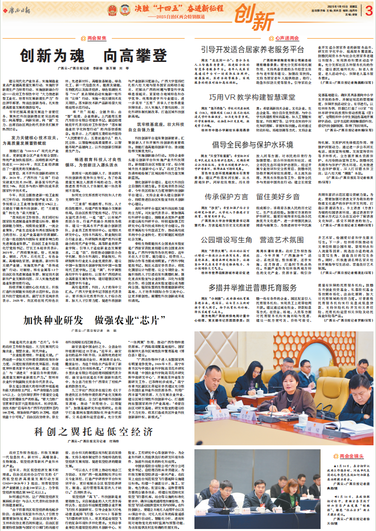 牢牢把握高质量发展这个首要任务,聚焦把科技创新摆在更突出的地位,向高攀登、向新突破、向“链”发力,出席自治区两会的代表委员们展开热烈讨论。