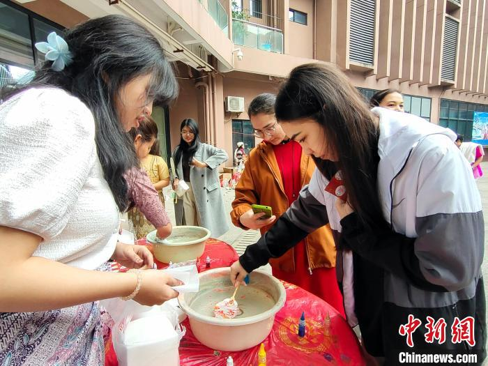 图为留学生在制作漆扇。中新网记者 黄艳梅 摄