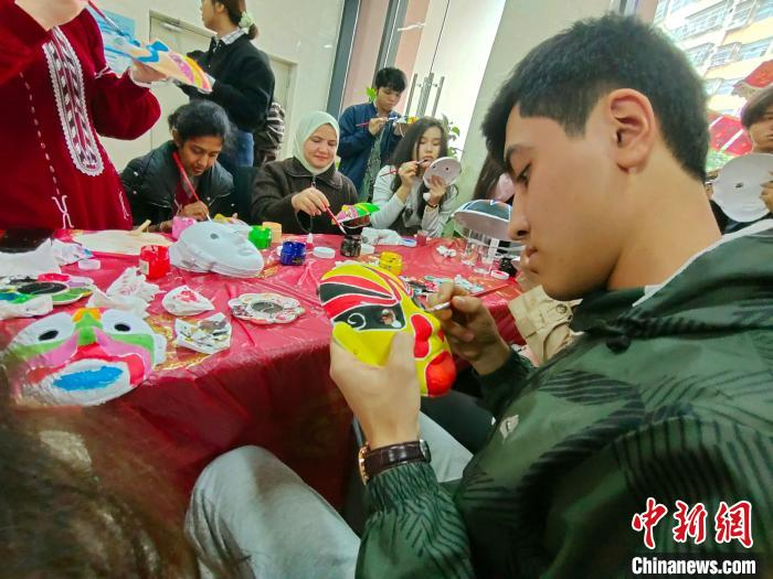 图为留学生在画脸谱。中新网记者 黄艳梅 摄