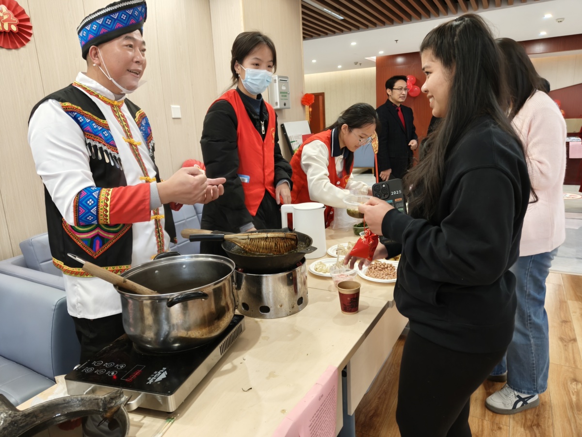 1月26日,广西中医药大学国际教育学院新春嘉年华精彩启幕,留学生们以饱满的热情展现了多元才艺。在游园活动中,留学生们亲手体验了剪纸艺术和香囊制作,还学会养生茶、中药奶茶及油茶的调制秘诀。推拿体验区热闹非凡,留学生们争相体验,感受中国传统医学的独特魅力。