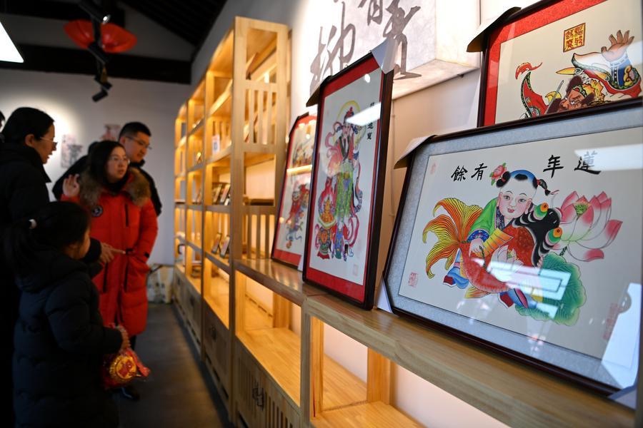 2月2日,游人在杨柳青古镇观赏年画。新华社记者 李然 摄