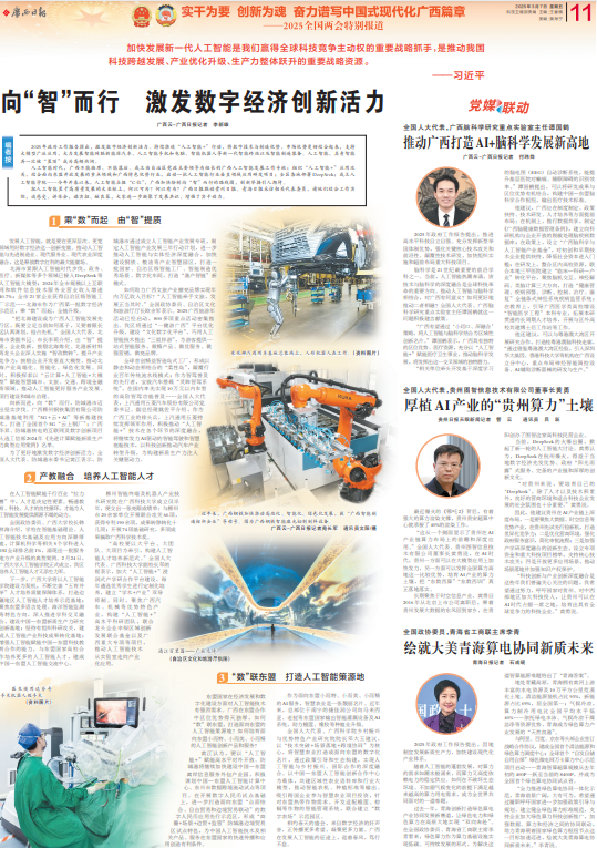 把人工智能置于高质量发展的大坐标上,何以可为?何以有为?广西日报联动贵州日报、青海日报采访相关代表委员,请他们结合工作实际,谈感受、讲体会,谋实招、献良策,大家进一步凝聚了发展共识、增强了实干动力。