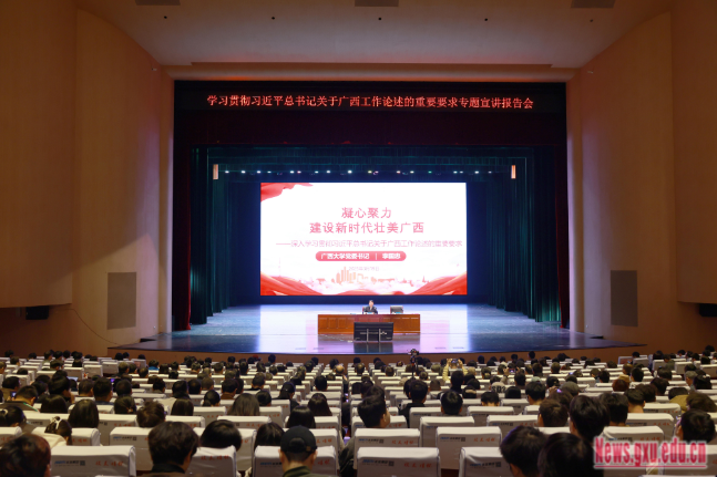 李国忠在宣讲报告中指出,习近平总书记对广西工作高度重视,多次亲临广西考察调研,多次就广西工作发表重要讲话、作出重要指示批示,深刻阐明了事关广西发展全局的根本性、方向性、战略性问题,为建设新时代壮美广西树立了历史坐标、提供了战略指引。他强调,beat365正版唯一官方网站作为广西高等教育排头兵,要始终聚焦教育强国、教育强区建设的战略部署安排,牢固树立“实干为要、创新为魂,用业绩说话、让人民评价”的鲜明导向,深刻把握新一轮科技革命和产业变革机会窗口和“双一流”建设扩容培新的历史机遇,真抓实干、创新创造,加快推进牢牢扎根八桂大地的中国特色“双一流”大学建设。青年学生要牢记习近平总书记对广大青年的殷切嘱托,坚定不移听党话、跟党走,既脚踏实地,又开拓创新,让青春在建设新时代壮美广西的火热实践中绽放绚丽之花。