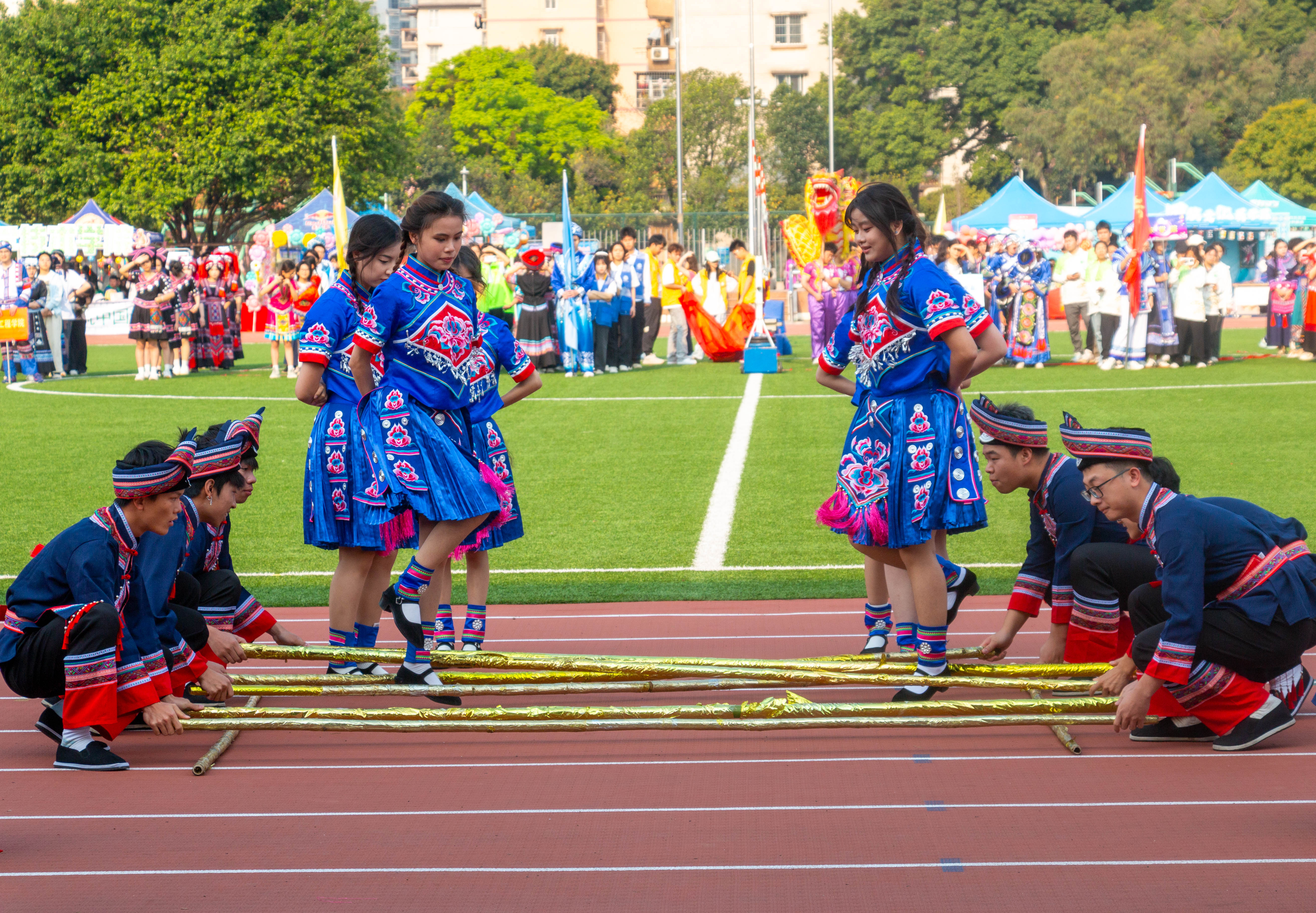 上午九点半,活动开幕式正式开始。百名学子身穿多彩的民族服装,在交错的竹竿间欢快跃动,展现出别样的民族风采。醒狮跳跃、祥龙舞动,伴着《幸福山歌》的节奏齐跳民族舞,现场喝彩声不断。