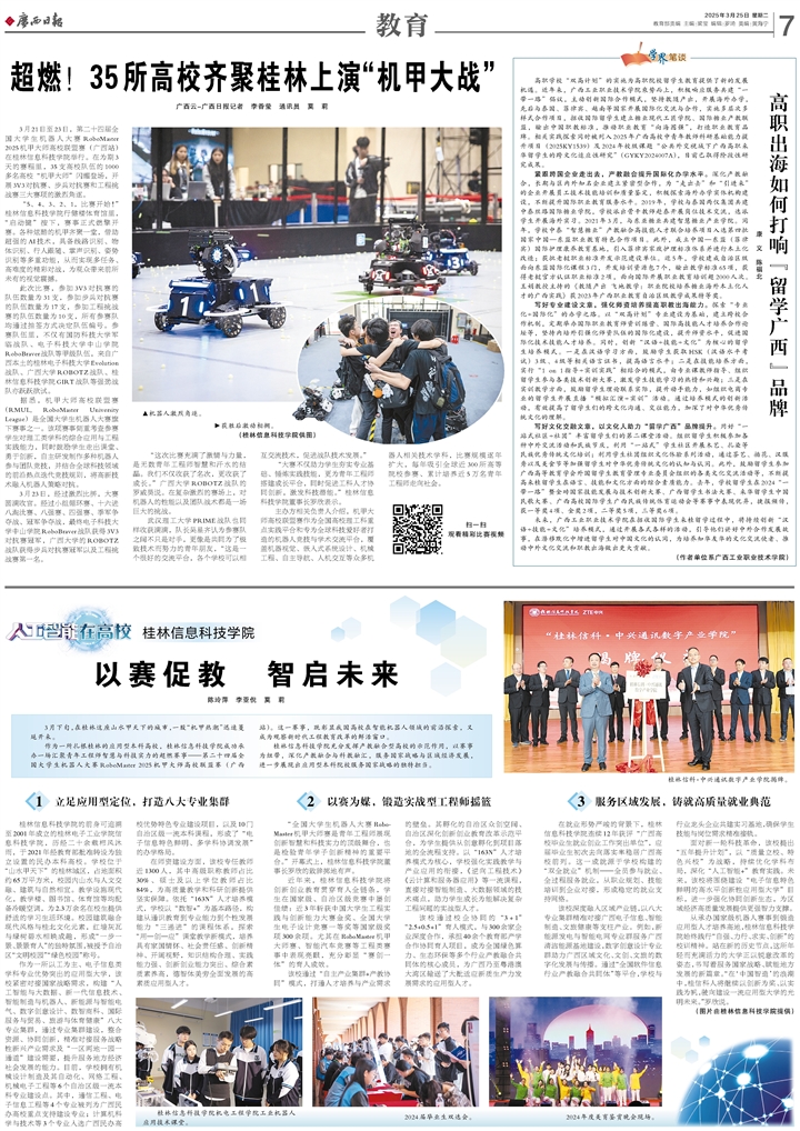 3月21日至23日,第二十四届全国大学生机器人大赛RoboMaster 2025机甲大师高校联盟赛(广西站)在桂林信息科技学院举行。在为期3天的赛程里,35支高校队伍的1000多名高校“机甲大师”闪耀登场,开展3V3对抗赛、步兵对抗赛和工程挑战赛三大赛项的激烈角逐。