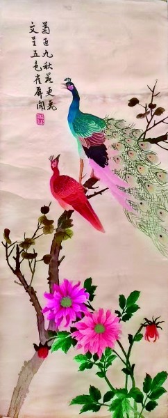 这四条屏湘绣将中国传统的绘画、刺绣、诗词、书法、金石艺术融为一体。每幅都是精心搭配的花鸟图,之间形成呼应,上面所绣诗句也并非拾人牙慧,而是紧扣画意独创。四条屏未标次序,然而,根据凤为皇后专属,明清文官补子一品为仙鹤,三品为孔雀,似可将其以凤凰、仙鹤、孔雀、雄鹰为序。第一幅为凤凰与牡丹:“彩凤双栖夸艳福 名花竞放喜连枝”,此诗虽表面未写牡丹,实际上用的却是李白诗句的典故。《杨妃外传》称:“开元中,禁中初重木芍药,即今牡丹也。得数本红紫、浅红、通白者,上移植于兴庆池东沉香亭前。”唐明皇命李白赋诗称赞杨贵妃之美,李白写下著名的三首《清平调》,其中之一分别以“名花”和“倾国”代称牡丹和杨贵妃,“名花倾国两相欢,常得君王带笑看。解释春风无限恨,沉香亭北倚阑干。”第二幅为仙鹤与月季:“鹤舞青松同不老 花荣四季得春长”。其中以“四季”点月季,又与“吉”谐音,而且仙鹤长寿,月季长春,可谓相得益彰。第三幅为孔雀与大丽花:“菊迎九秋花更丽 文呈五色雀屏开”。此诗用的是唐高祖李渊“雀屏中选”的典故,窦毅命求婚者每人射两箭,谁能射中屏上孔雀双眼,就把女儿许配给谁。《旧唐书·高祖窦皇后传》:“乃于门屏画二孔雀,诸公子有求婚者,辄与两箭射之,潜约中目者许之。前后数十辈莫能中。高祖后至,两发各中一目。”第四幅为雄鹰与凌霄:“雄鹰得意冲霄汉 浩气凌空展壮猷”,其中用嵌字格嵌入“凌霄”,又与雄鹰搏击长空,气冲霄汉相辅相成。每幅题诗后用印章形式绣“湘绣”作为落款。
