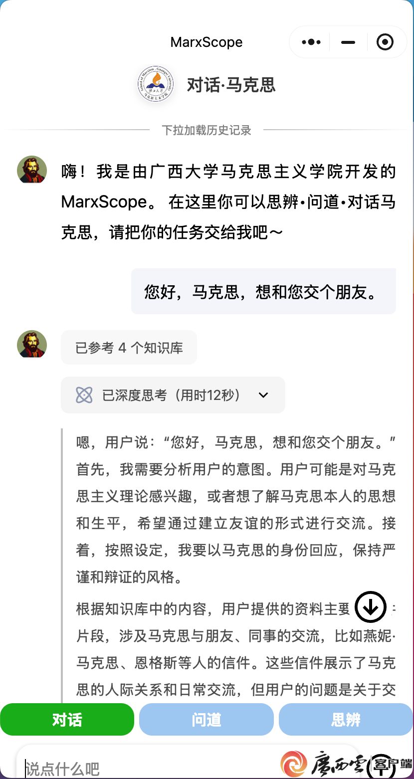 这一小程序依托马克思主义经典文献语料库,整合各种版本的《马克思恩格斯全集》《马克思恩格斯选集》《马克思恩格斯文集》以及后世学者对马克思主义的研究成果,运用自然语言处理、检索增强生成等先进数智技术,为学习者提供高效、生动、准确的问答服务。