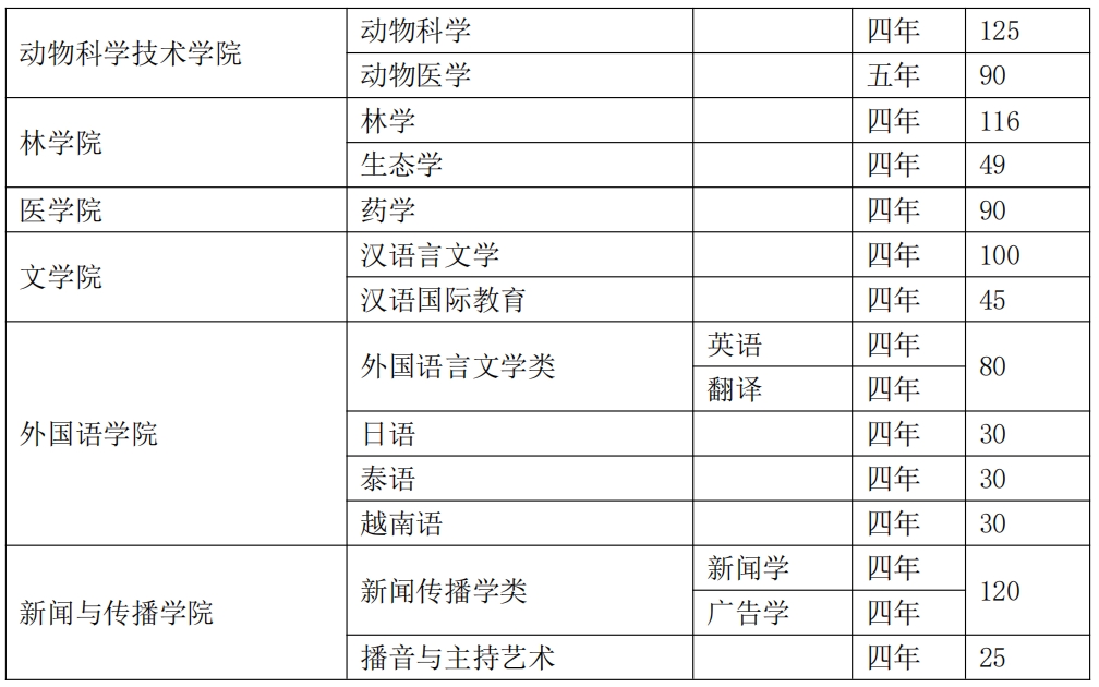 学校开设君武学堂创新人才培养实验班(创培班),以“以研促学、通专融合、个性发展”为原则,强化培养学生科学精神、科学素养、科学能力,激发学生创新潜力,旨在造就一批理论基础扎实、专业素养高、创新能力强、有志于从事科学研究和技术创新的研究型人才。创培班有生物育种及生命科学创培班、物质科学创培班两个跨学院创培班,有数学创新人才培养实验班、中国-东盟金融经贸创培班、土木“智能建造与智慧运维”创新人才培养实验班、化学化工创培班、物理电子创培班、智能会计与智慧财务创新人才培养实验班、轻工科学“院士领航”创培班。创培班实行“一班一策”,即一个创培班单独一套培养方案,开设交叉学科课程、前沿科技课程等核心课程,强化交叉融合,提升创新能力。创培班学制四年,学校允许3年级创培班学生报考硕士研究生,符合条件者可推荐免试攻读研究生。