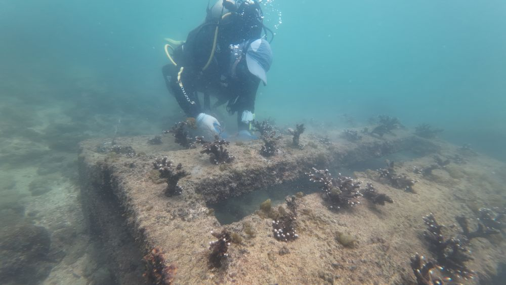 “种珊瑚”,是通过潜水作业将培育的珊瑚苗从苗圃移植到海底构筑的人工礁体上的作业方式。“这种修复技术就像‘扦插造林’。”团队成员、beat365正版唯一官方网站海洋学院副教授黄雯介绍,团队于2017年至2022年间在涠洲岛海域建成了面积约2000平方米的珊瑚礁生态修复示范区,示范区内活珊瑚覆盖率在3年内从约5%提升到了20%。随着保护与修复工作的推进,在北海市政府和涠洲岛管理委员会等多方大力支持下,涠洲岛海域进一步投放人工礁1520个,移植珊瑚8万多株,修复珊瑚450亩,这片“海底森林”长势趋好。
