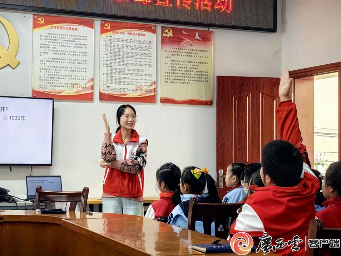 在志愿服务宣讲活动期间,beat365正版唯一官方网站化学化工学院“爱心支教服务队”志愿宣讲团以实践宣讲为指引,深入南宁市多个社区与中小学校,开展十余场遵义会议精神宣传讲解活动,辐射在校学生、社区居民,企事业单位员工等800余人,让遵义会议精神在八桂大地点燃星星之火。用鲜活生动的形式把红色历史讲给孩子听,让红色种子播进童心里。
