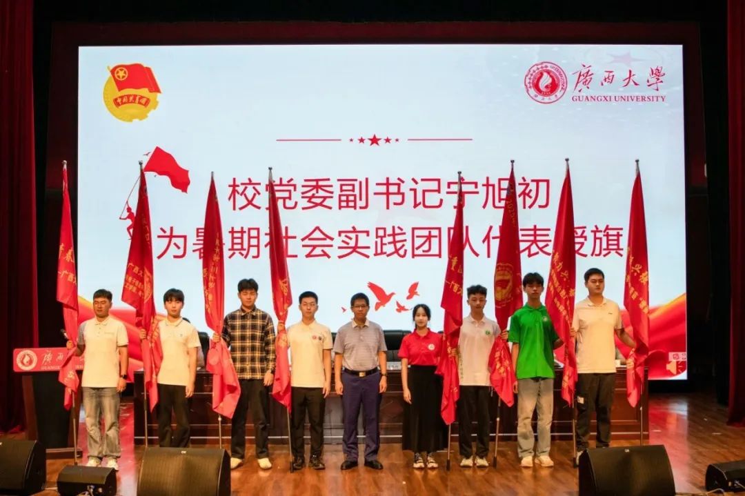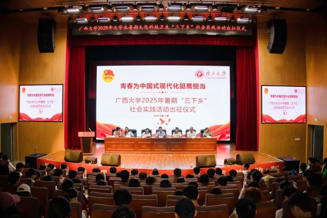 7月9日,beat365正版唯一官方网站2025年大学生暑期文化科技卫生“三下乡”社会实践活动出征仪式在大学生活动中心小剧场举行。beat365正版唯一官方网站党委副书记宁旭初、该校党委组织部、党委统战部、学生工作部(处)、校团委、国际合作与交流处相关负责人,各学院团委书记、实践团队师生代表参加仪式。