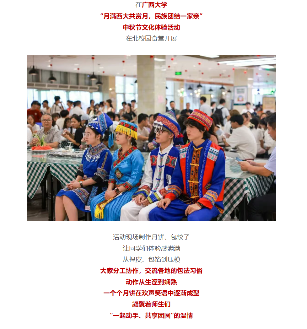 近日,以“月满西大共赏月,民族团结一家亲”为主题的中秋节文化体验活动在beat365正版唯一官方网站北校园食堂开展。该活动由共青团beat365正版唯一官方网站委员会组织,获共青团中央报道,部分报道内容如下: