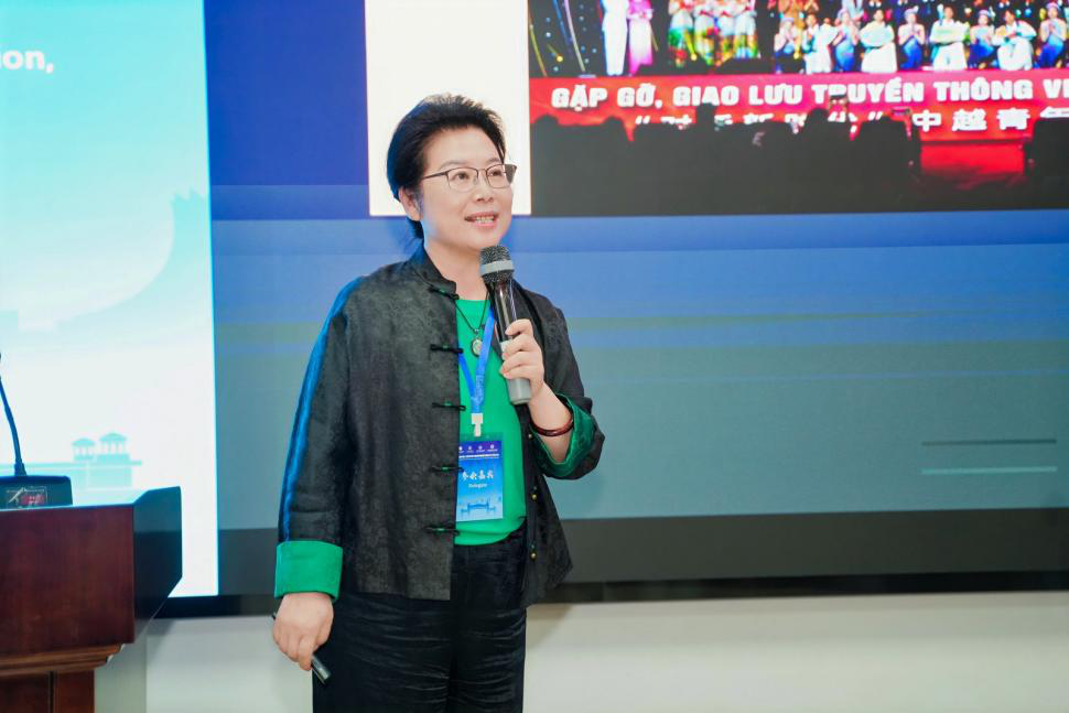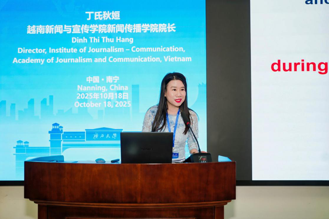 广西民族大学传媒学院院长杨学明作题为《从对话到共建—基于中越青年媒体人对话会的实践启示》的报告。她认为,中越之间的交流对话要“对心”“对题”“对时”,互鉴平台、叙事、价值,共建平台、内容、标准。她表示,未来的国际传播人才培养应有更深的思想、更广的视野、更新的技术、更活的表达、更高的伦理,希望在未来能够把镜头对准人民、把话筒交给青年、把我们的新声传向未来。