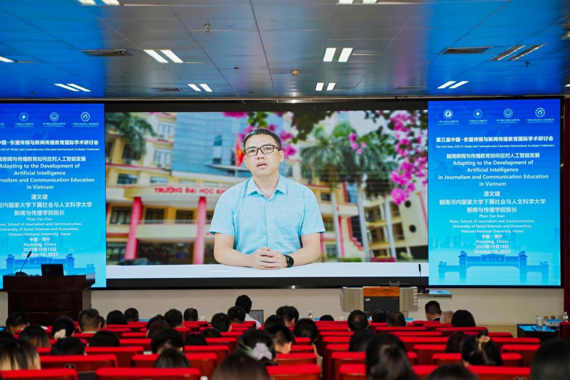 越南河内国家大学下属社会与人文科学大学新闻与传播学院院长潘文建作题为《越南新闻与传播教育如何应对人工智能发展》的报告。他结合学校教学实践,分享了人工智能技术与新闻传播专业相融合的经验。他表示,AI能更快速讲述故事,但只有人用心将事情真相告知大众。