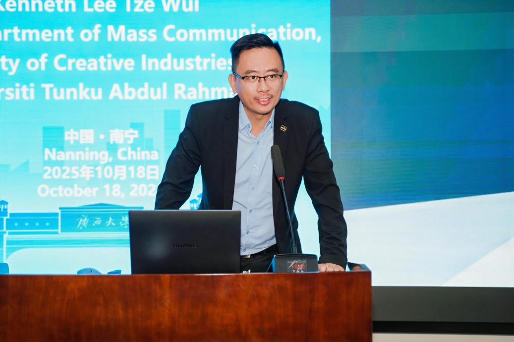 马来西亚拉曼大学创意产业学院大众传媒系主任李知鍏作题为《从CapCut到DeepSeek:重新思考UTAR的新闻教育》的报告,他分享了马来西亚拉曼大学如何适应人工智能变革中的新格局。他指出,拉曼大学正在把AI相关内容增加到课程设置中,将人工智能入门知识和信息核心课程融入所有课程的同时,对学生进行信息素养的相关培训。他希望未来学生能以更好地融合速度、素养与创造力,适应人工智能新时代。