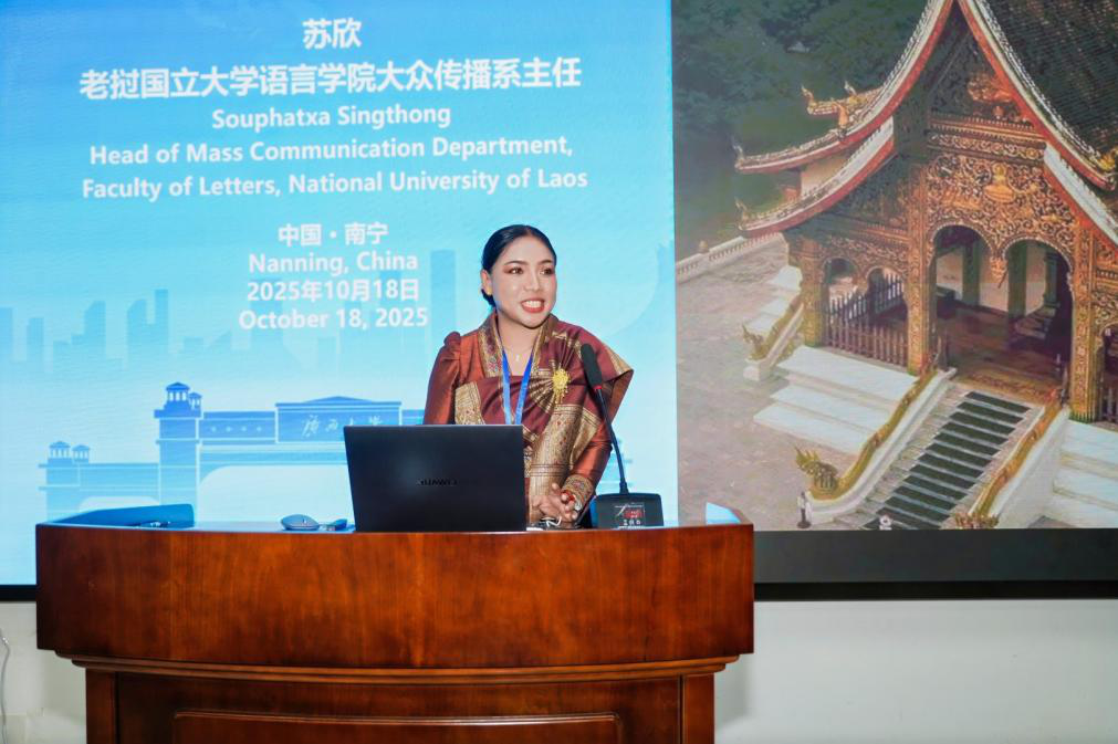 老挝国立大学语言学院大众传播系主任苏欣作题《从内陆到陆联:老挝国立大学培养高质量4.0专业人才》的报告,她分享了老挝国立大学如何在学生群体中推广使用人工智能,如何开展技术创新教育与培训活动。她强调,学生在使用人工智能时必须保持创意主导权,由学生引领人工智能,为国家的数字化转型做出贡献。