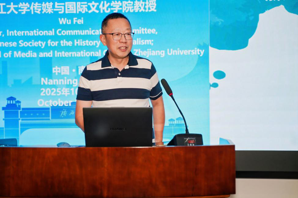 中国新闻史学会国际传播专业委员会理事长、浙江大学教授吴飞作题为《全球共通:国际传播新理论范式的哲学根基探索》的报告。他从文明冲突论的局限出发,提出国际传播理论反思;从哲学角度,探讨了人类交往的本质,并根据哈贝马斯、海德格尔等人的哲学理论,提出了国际传播理论新范式。他认为,承认存在,同时要接受对方,理解对方,尊重对方,这个世界才有可能真正做到“各美其美”。