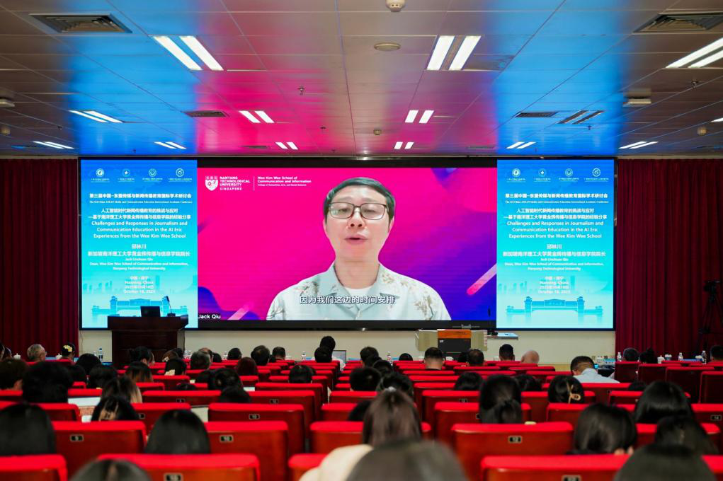 新加坡南洋理工大学黄金辉传播与信息学院院长邱林川教授作题为《人工智能时代新闻传播教育的挑战与应对》报告。他结合实践案例,探讨了人工智能时代学生的教育问题。他指出,学院最重要的宗旨是做好AI的同时,让新闻更专业、更标准,并保持自己的特色,避免成为别人的工具。他表示,在AI的时代转变教学目标,要更加强调:让新闻传播教育的学生,批判性地运用这些工具,要让学生能够找到自己的声音。