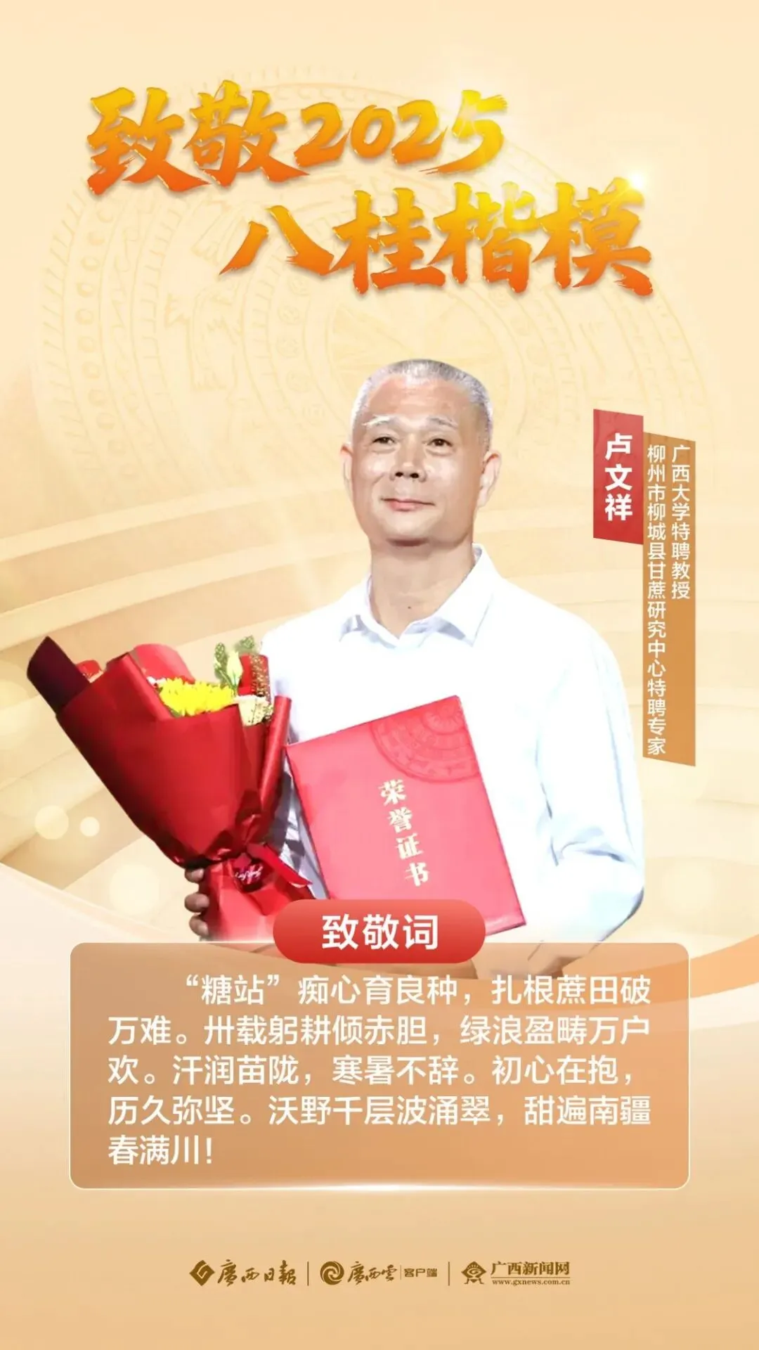 在时代奔涌的浪潮中,总有一些身影挺身而出,以担当诠释使命,用行动铸就不凡:从柳城县甘蔗研究中心特聘专家卢文祥深耕田间的科研坚守,到荔浦市特殊教育学校校长熊碧芳用爱点亮特殊儿童的成长之路;从广西大瑶山国家级自然保护区长滩河保护站龙道山护林点负责人黄通甫与青山为伴的默默守护,到崇左市大新边境管理大队硕龙边境派出所德天女警先锋队戍边卫国的铿锵身影,再到桂林蓝宇航空轮胎发展有限公司航空轮胎项目研发团队攻坚核心技术的创新突破——他们,用智慧浇灌理想,用奋斗镌刻荣光,在凝心聚力建设新时代壮美广西的征程上书写精彩答卷。