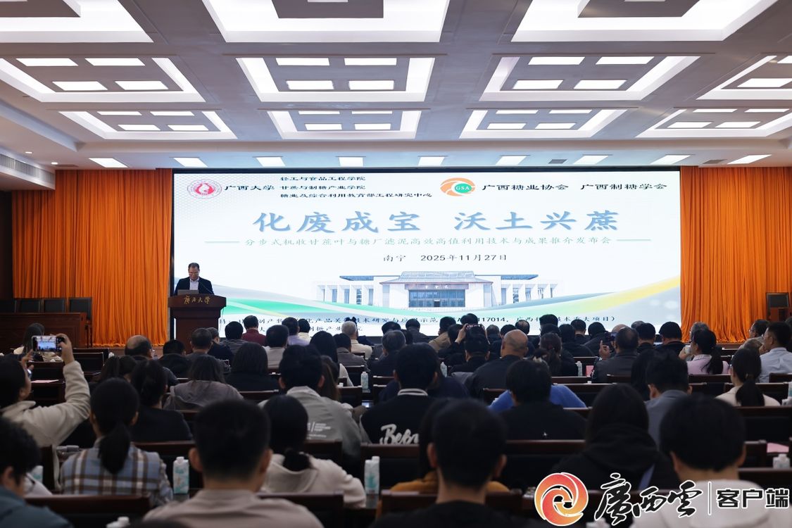 11月27日,以“科技赋能、助力机收”为主题的“分步式机收甘蔗叶与糖厂滤泥高效高值利用”技术与成果推介发布会在beat365正版唯一官方网站举行。发布会由beat365正版唯一官方网站轻工与食品工程学院、甘蔗与制糖产业学院、糖业及综合利用教育部工程研究中心、广西糖业协会和广西制糖学会联合主办,来自相关政府部门、行业协会、高校、制糖企业负责人和代表共100余人参会。