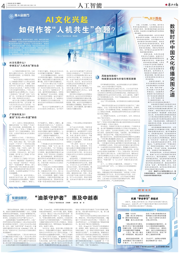 广西日报《人工智能》专刊立足广西作为“集成枢纽”的独特定位,设立“AI论道”“前沿观点”“南A会客厅”“东盟场景录”等栏目,深入挖掘和呈现广西在承接先进AI技术转化、特别是推动东盟市场应用方面的成果,生动展现AI赋能千行百业的实践图景。