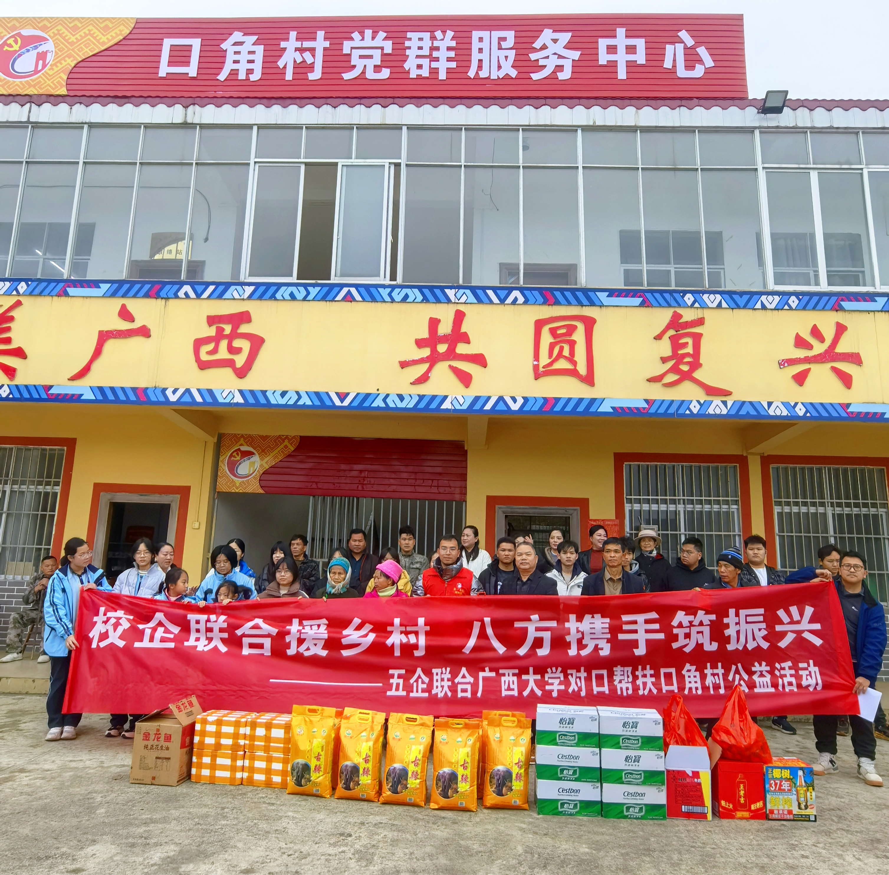 上午11时,简短的捐赠仪式后,口角村的村民和学生们已经在村部广场上排起了整齐的队伍,脸上满是期待与喜悦。