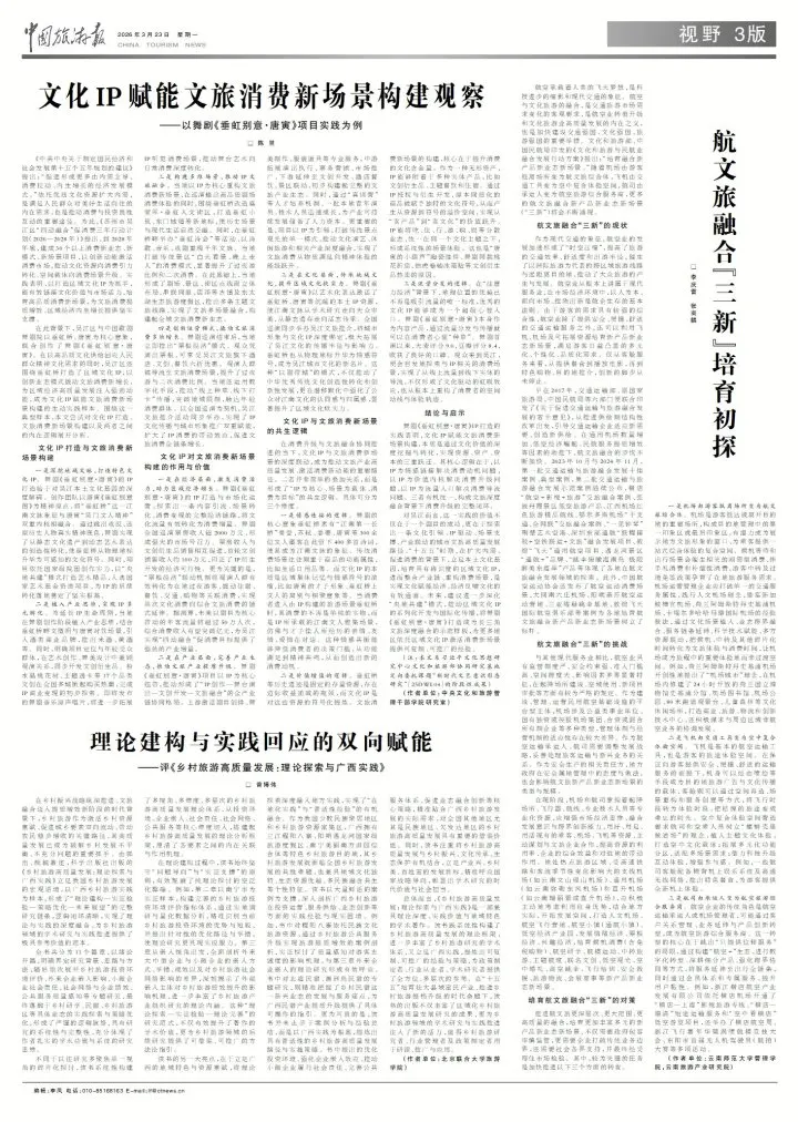 总体而言,《乡村旅游高质量发展:理论探索与广西实践》是一部兼具理论深度、实践价值与地域特色的学术著作。该书既系统性构建了乡村旅游高质量发展的理论框架,进一步丰富了乡村旅游研究的学术体系,又立足广西实践,提炼出可复制、可推广的经验与策略,为政策制定者、行业从业者、学术研究者提供了全方位、多层次的参考。在“十五五”培育壮大县域富民产业、推进乡村旅游提档升级的时代命题下,该书的出版不仅丰富了区域化乡村旅游高质量发展研究的成果,更为乡村旅游领域的学术研究与实践推进注入了新的活力,值得乡村旅游研究者、行业管理者及政策制定者用于研读、推广与应用。