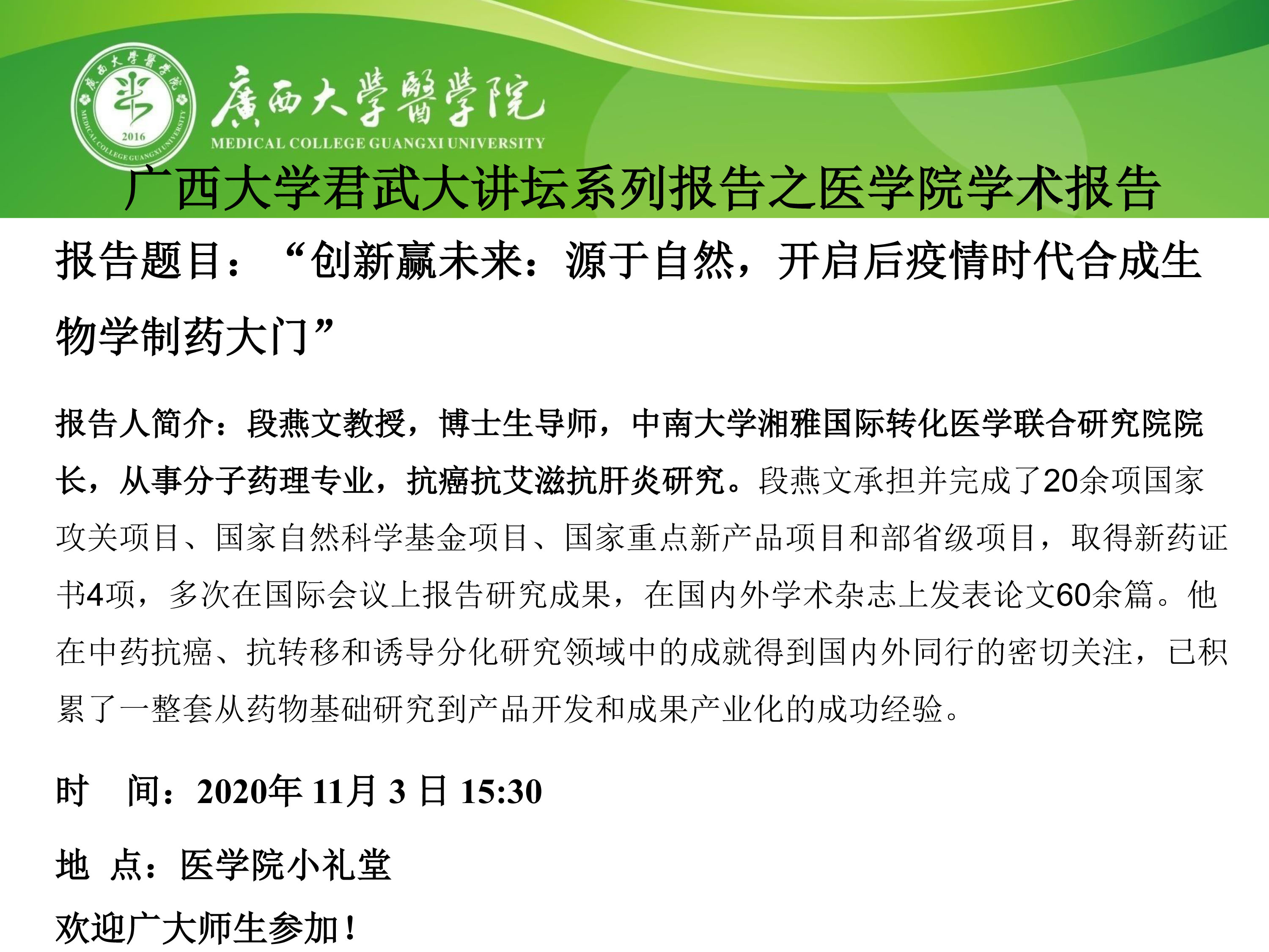 beat365正版唯一官方网站君武大讲坛系列报告之医学院学术报告:“创新赢未来:源于自然,开启后疫情时代合成生物学制药大门”