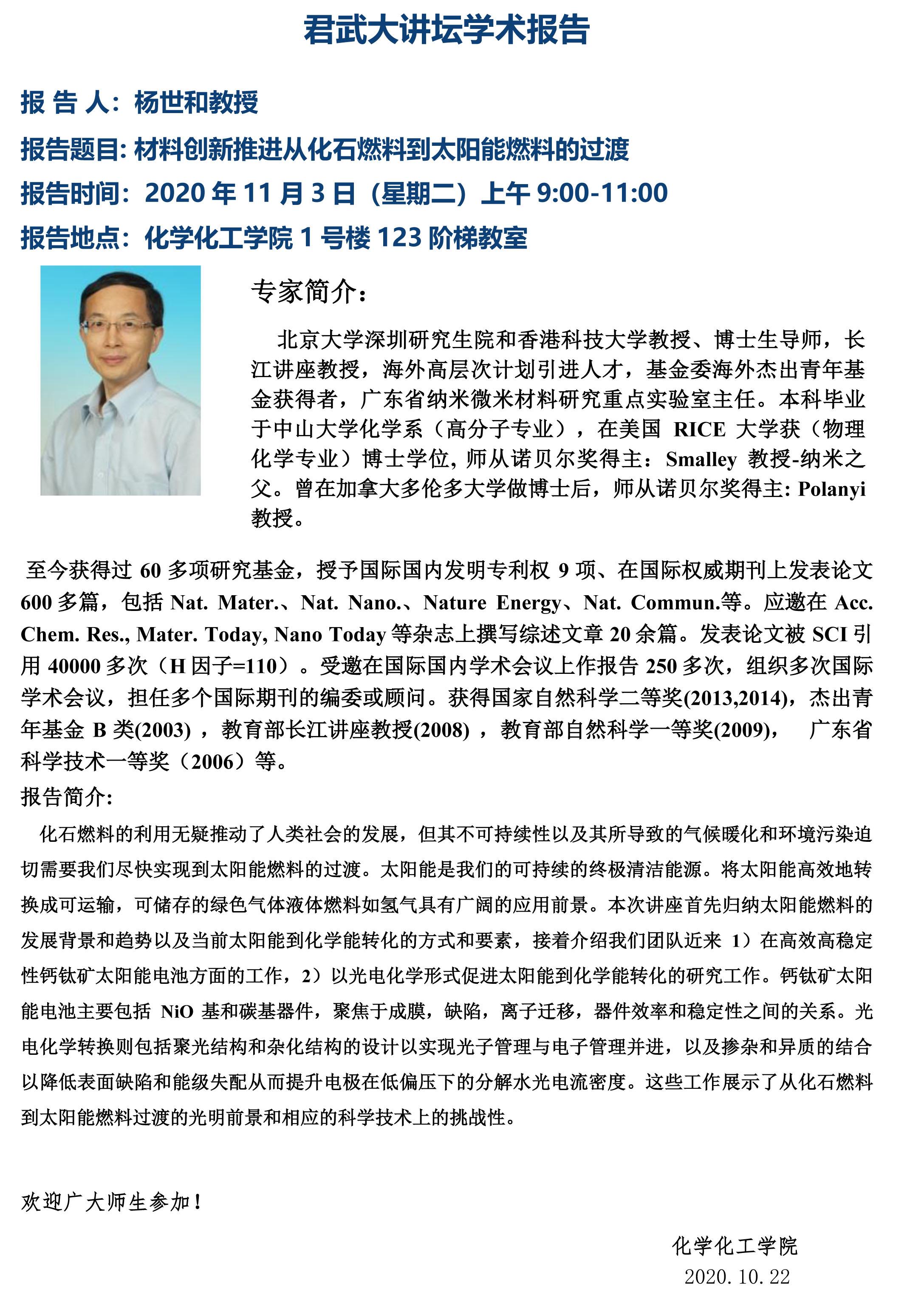 君武大讲坛学术报告:材料创新推进从化石燃料到太阳能燃料的过渡