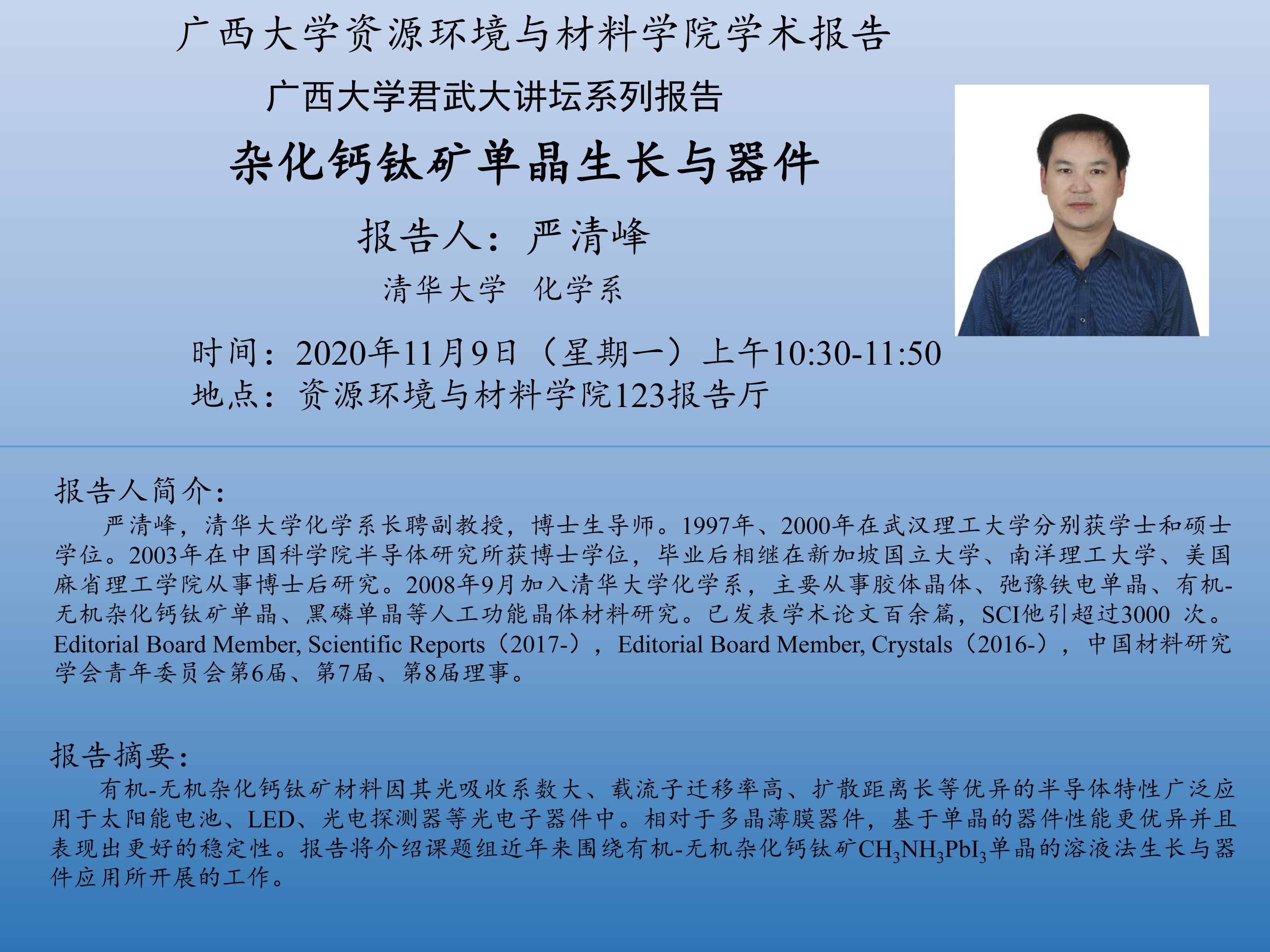 资源环境与材料学院学术报告:“beat365正版唯一官方网站君武大讲坛系列”杂化钙钛矿单晶生长与器件