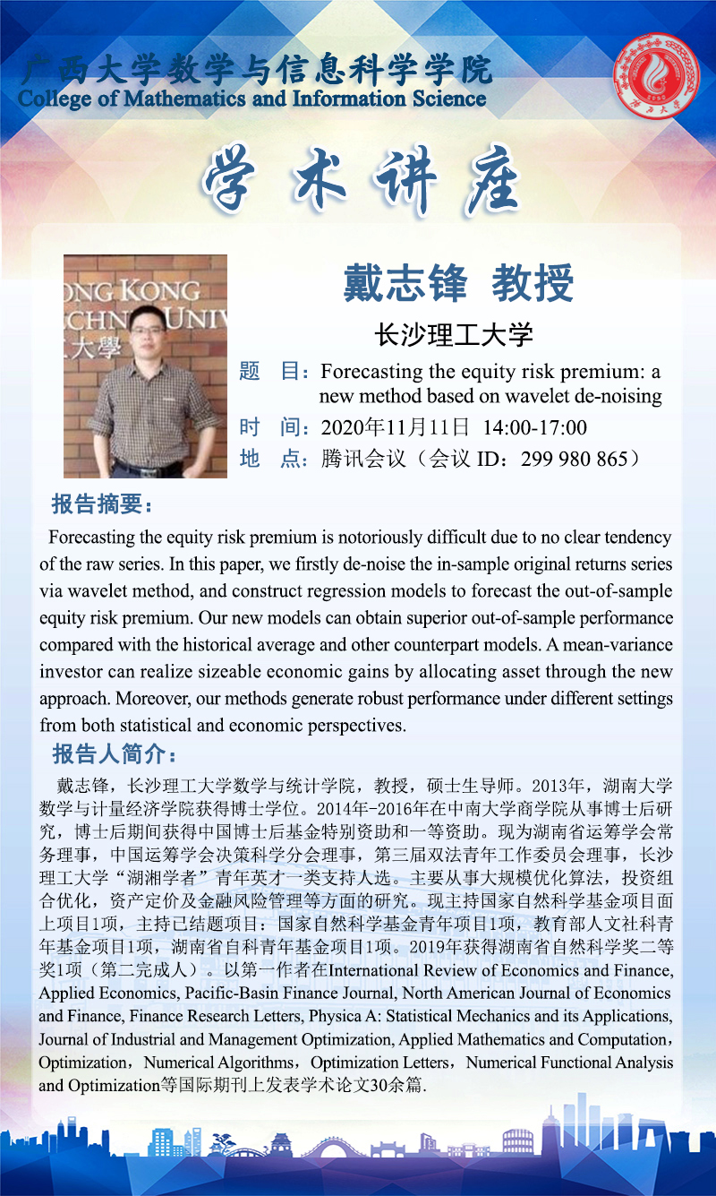 数学与信息科学学院学术报告:Forecasting the equity risk premium: a new method based on wavelet de-noising