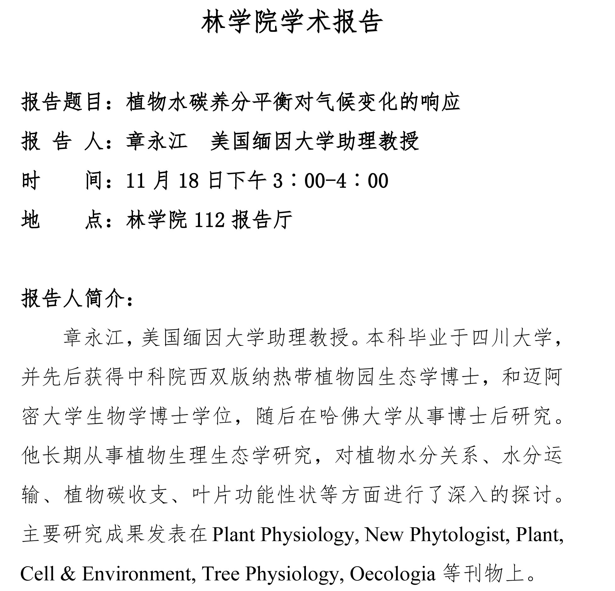 林学院学术报告:植物水碳养分平衡对气候变化的响应