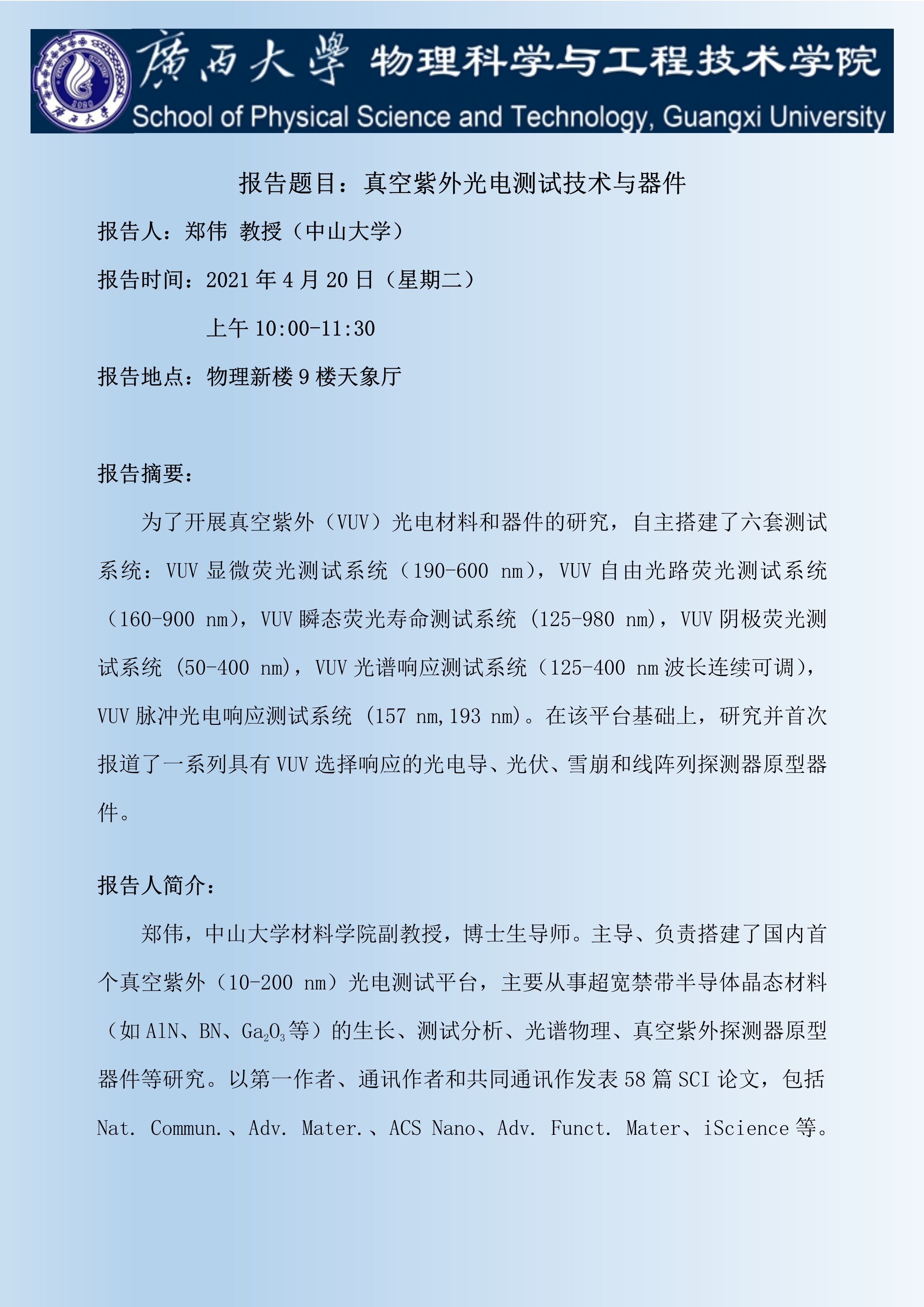 物理科学与工程技术学院学术报告:真空紫外光电测试技术与器件