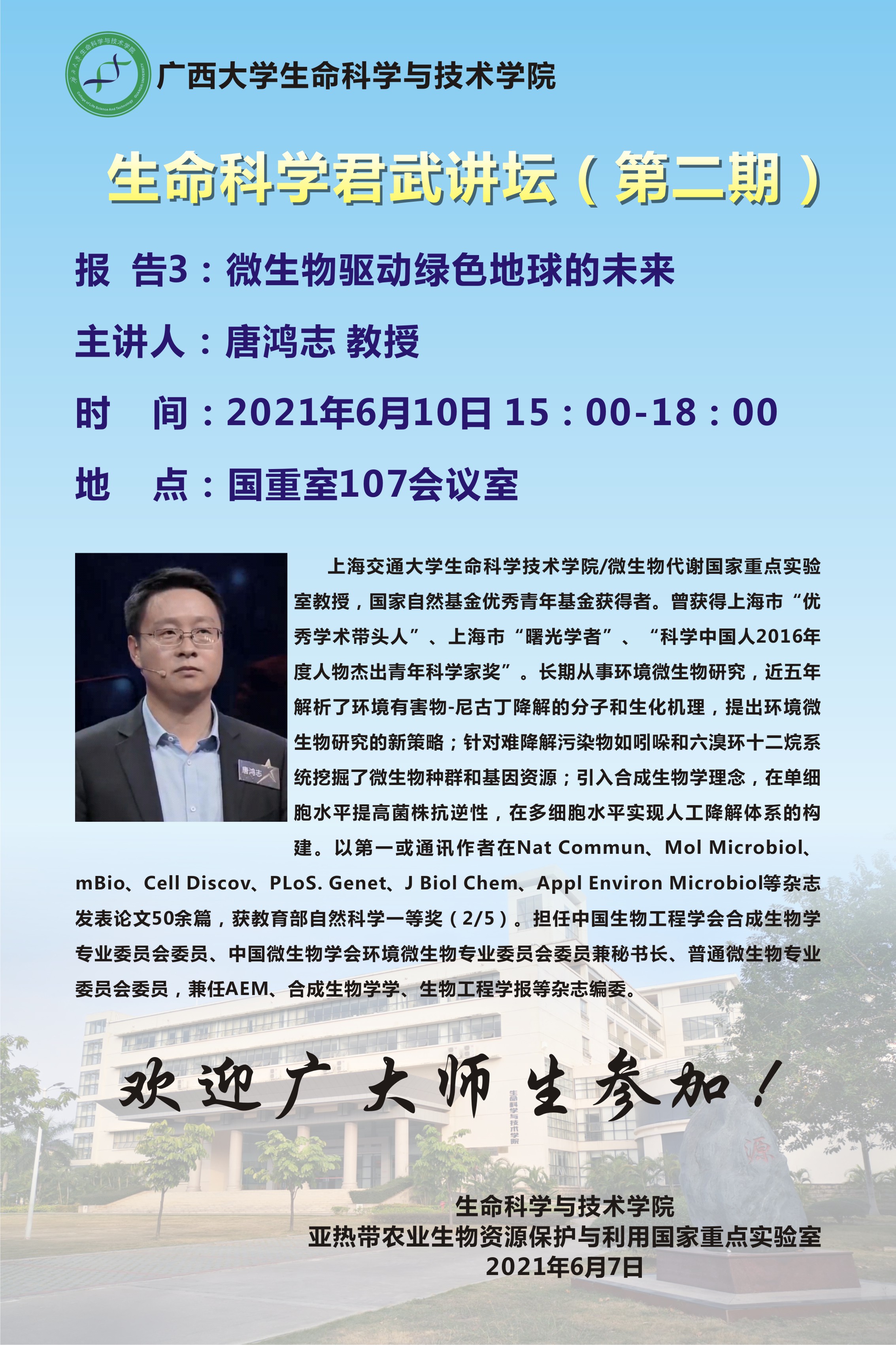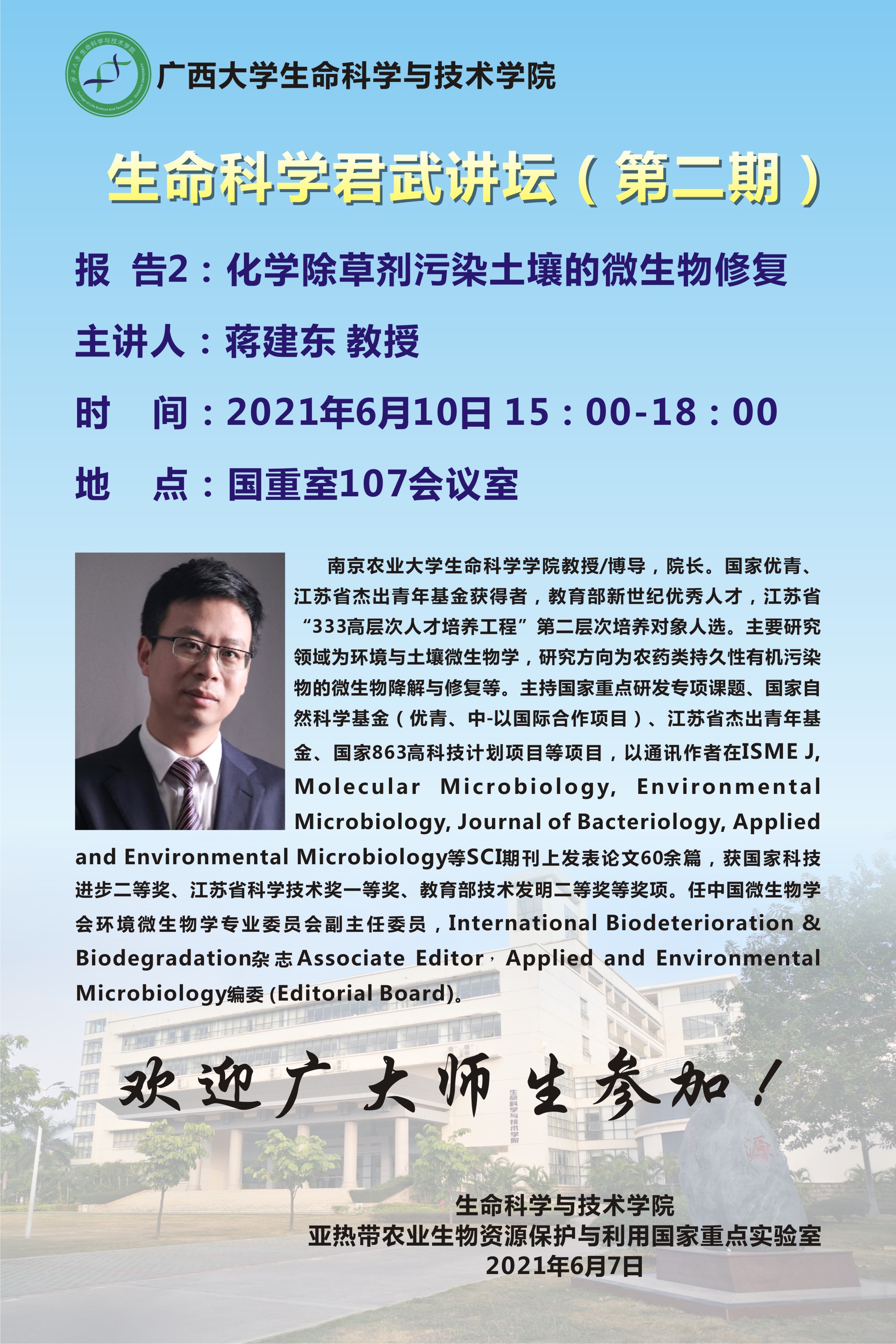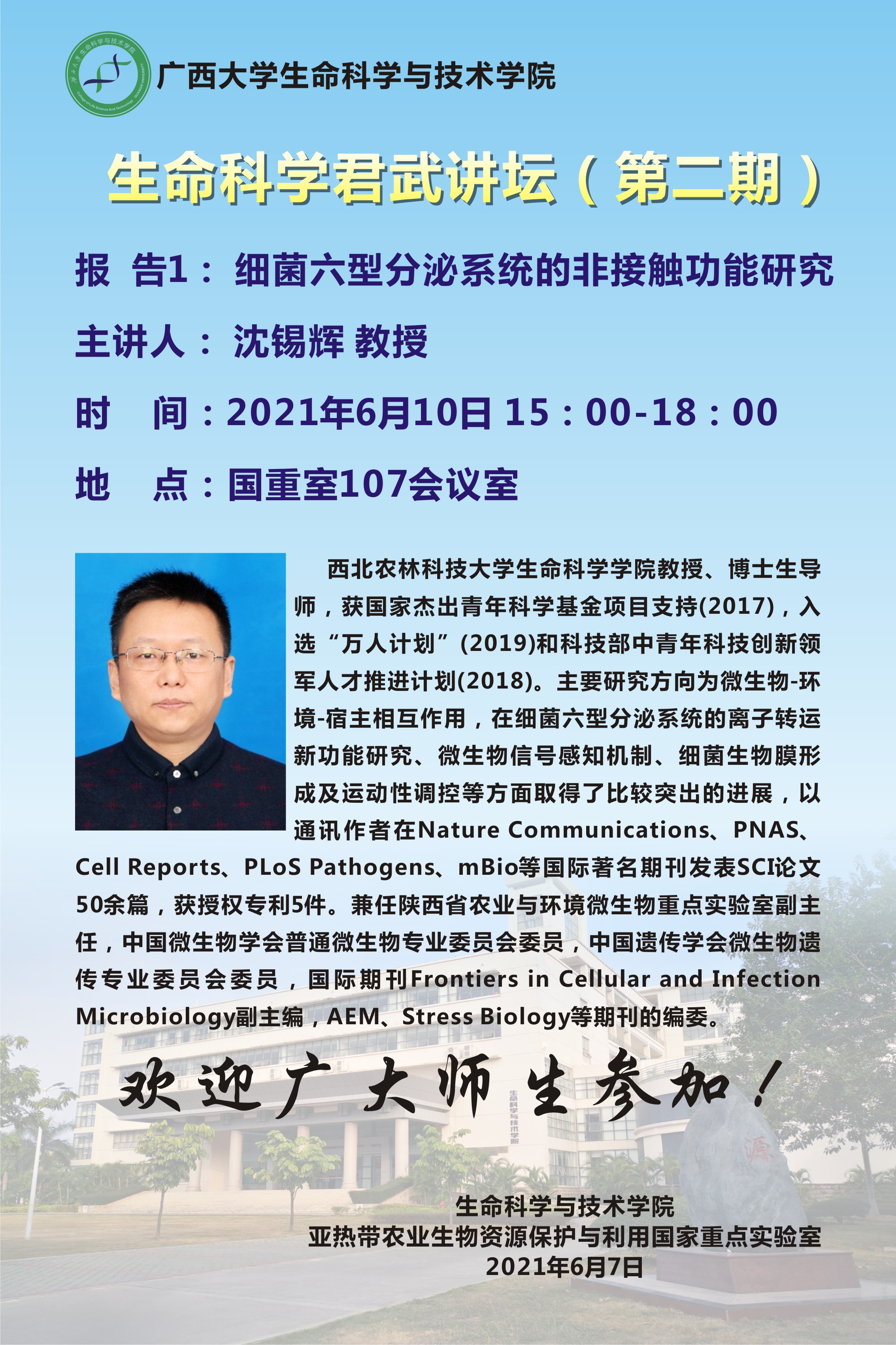 生命科学君武讲坛(第二期):细菌六型分泌系统的非接触功能研究;化学除草剂污染土壤的微生物修复;微生物驱动绿色地球的未来