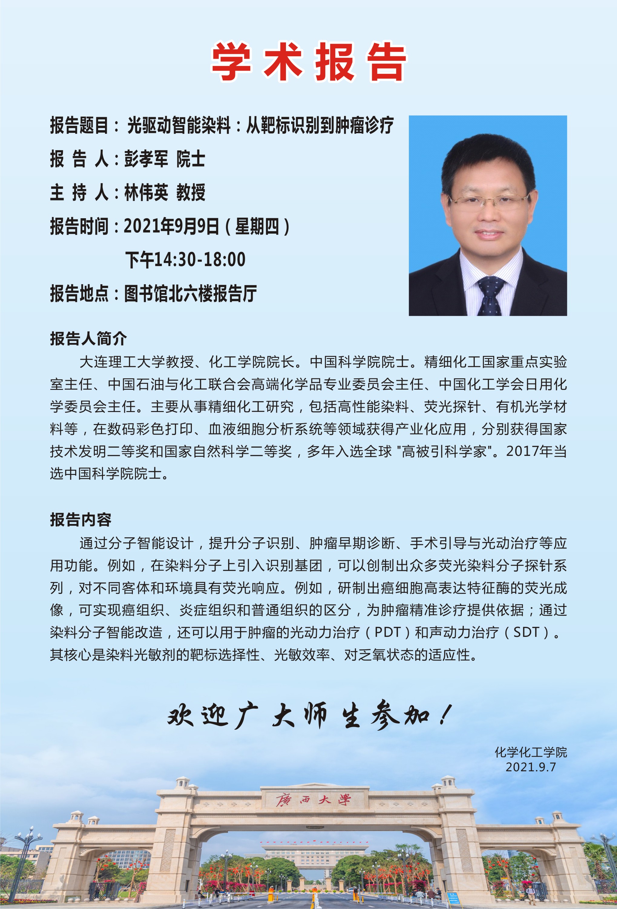 化学化工学院学术报告:光驱动智能染料:从靶标识别到肿瘤诊疗