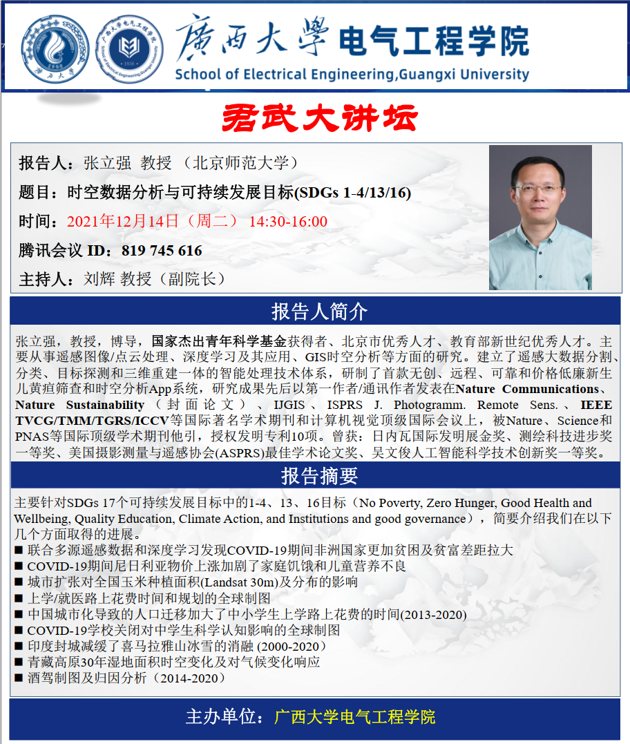 电气工程学院君武大讲坛:时空数据分析与可持续发展目标(SDGs 1-4/13/16)