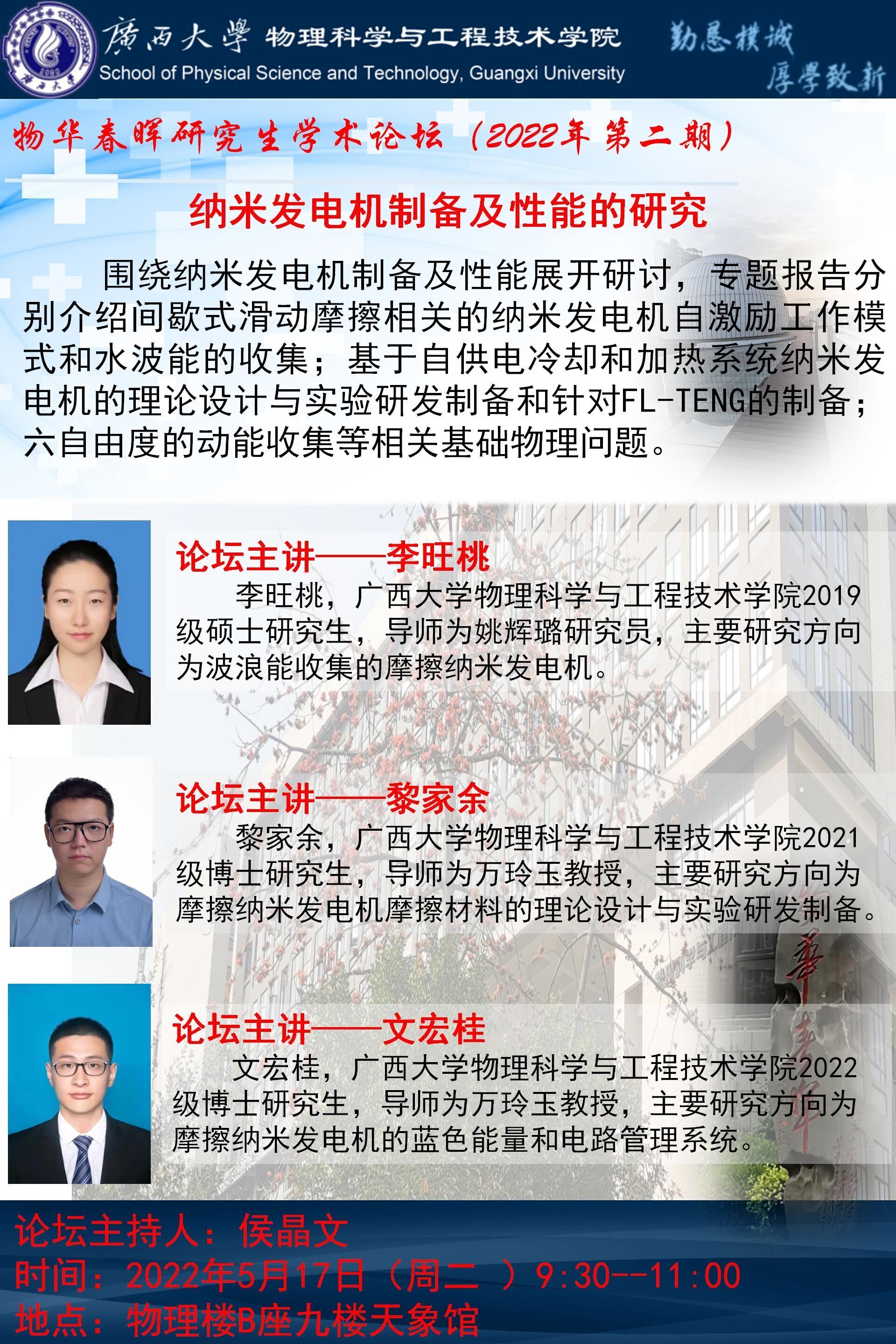 物理学院物华春晖学术论坛(第二期):纳米发电机制备及性能的研究