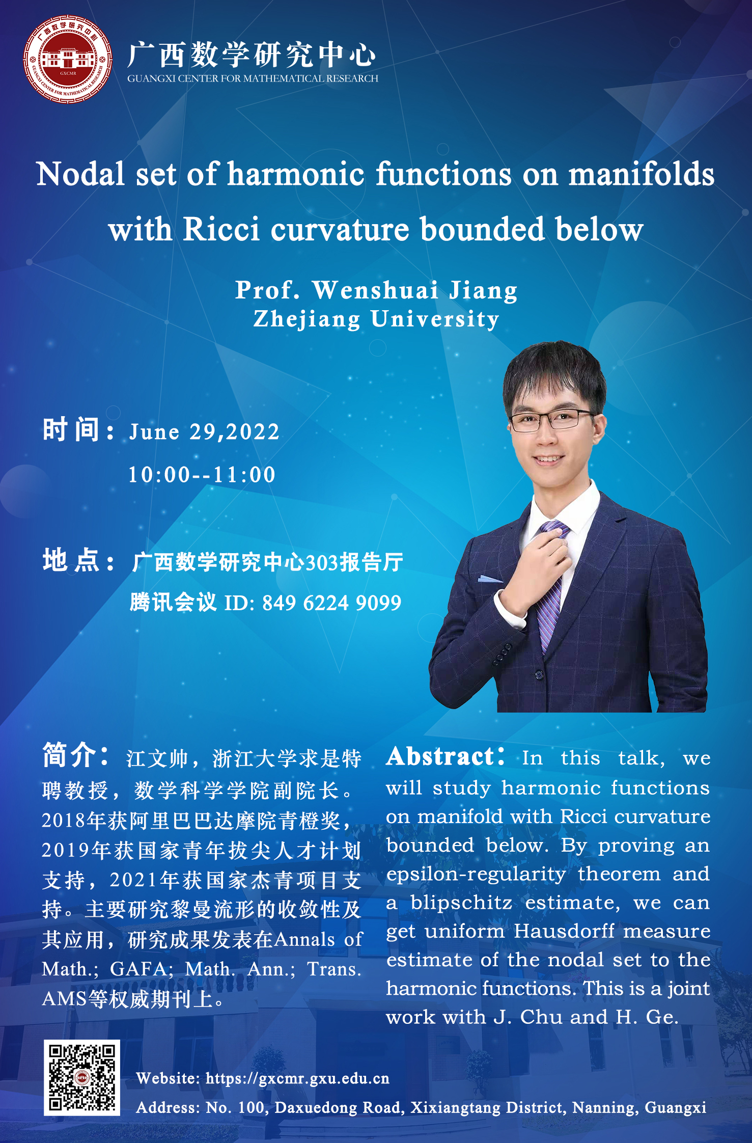 广西数学中心学术海报:Nodal set of harmonic functions on manifolds with Ricci curvature bounded below