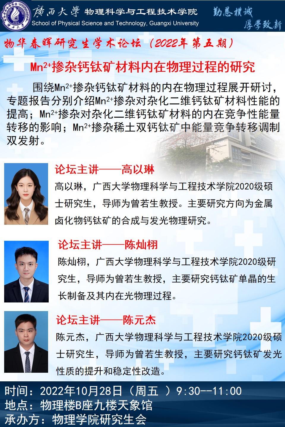 物理学院物华春晖学术论坛(第五期):Mn2+掺杂钙钛矿材料内在物理过程的研究