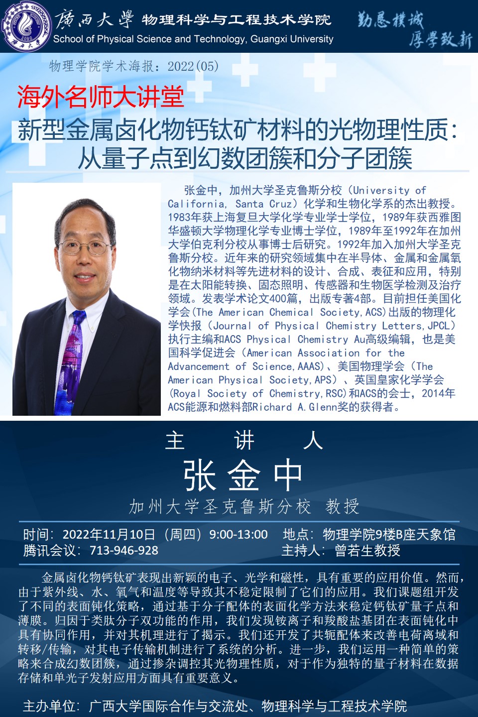 物理科学与工程技术学院海外名师大讲堂 新型金属卤化物钙钛矿材料的光物理性质从量子点到幻数团簇和分子团簇