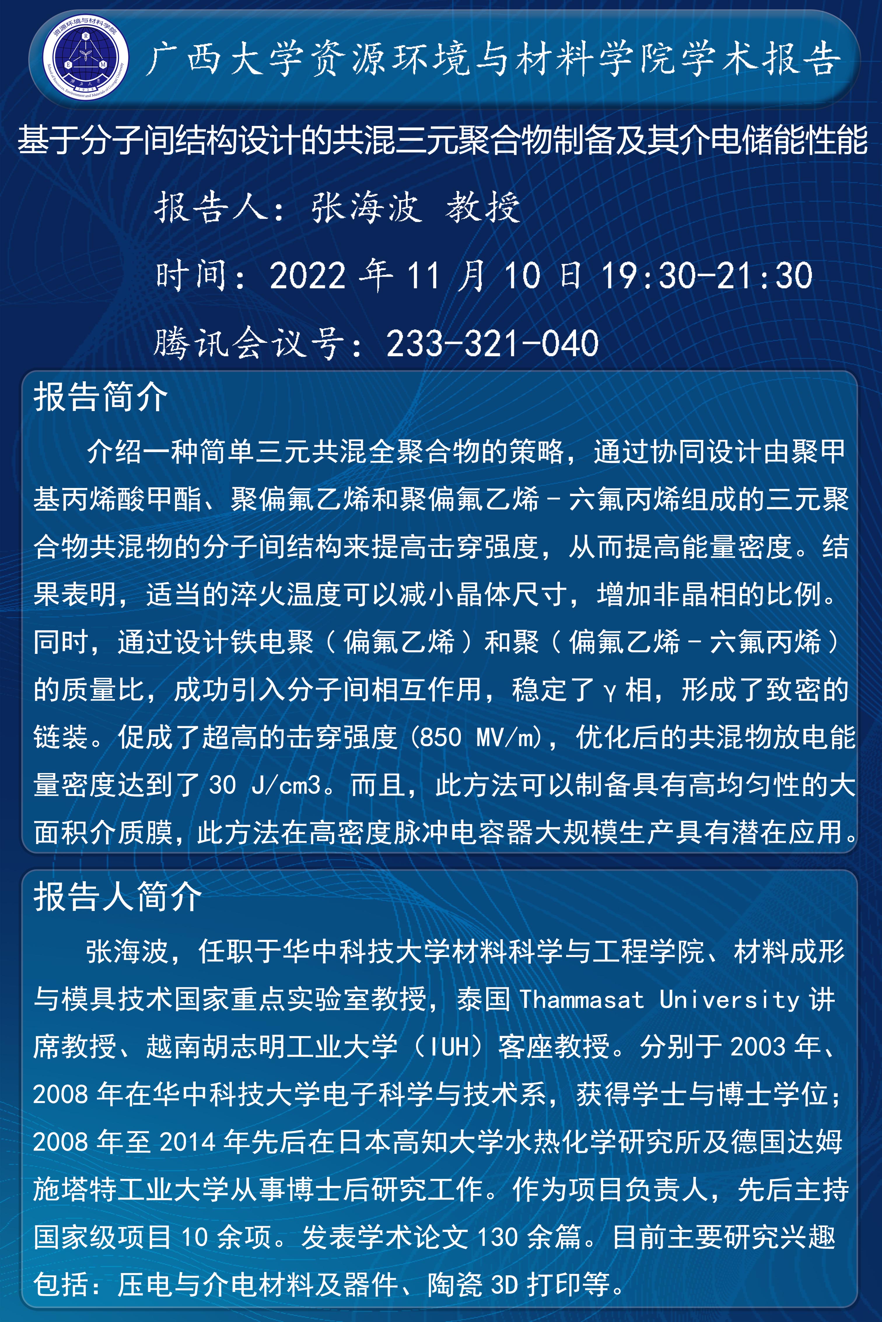 资源环境与材料学院学术报告:基于分子间结构设计的共混三元聚合物制备及其介电储能性能