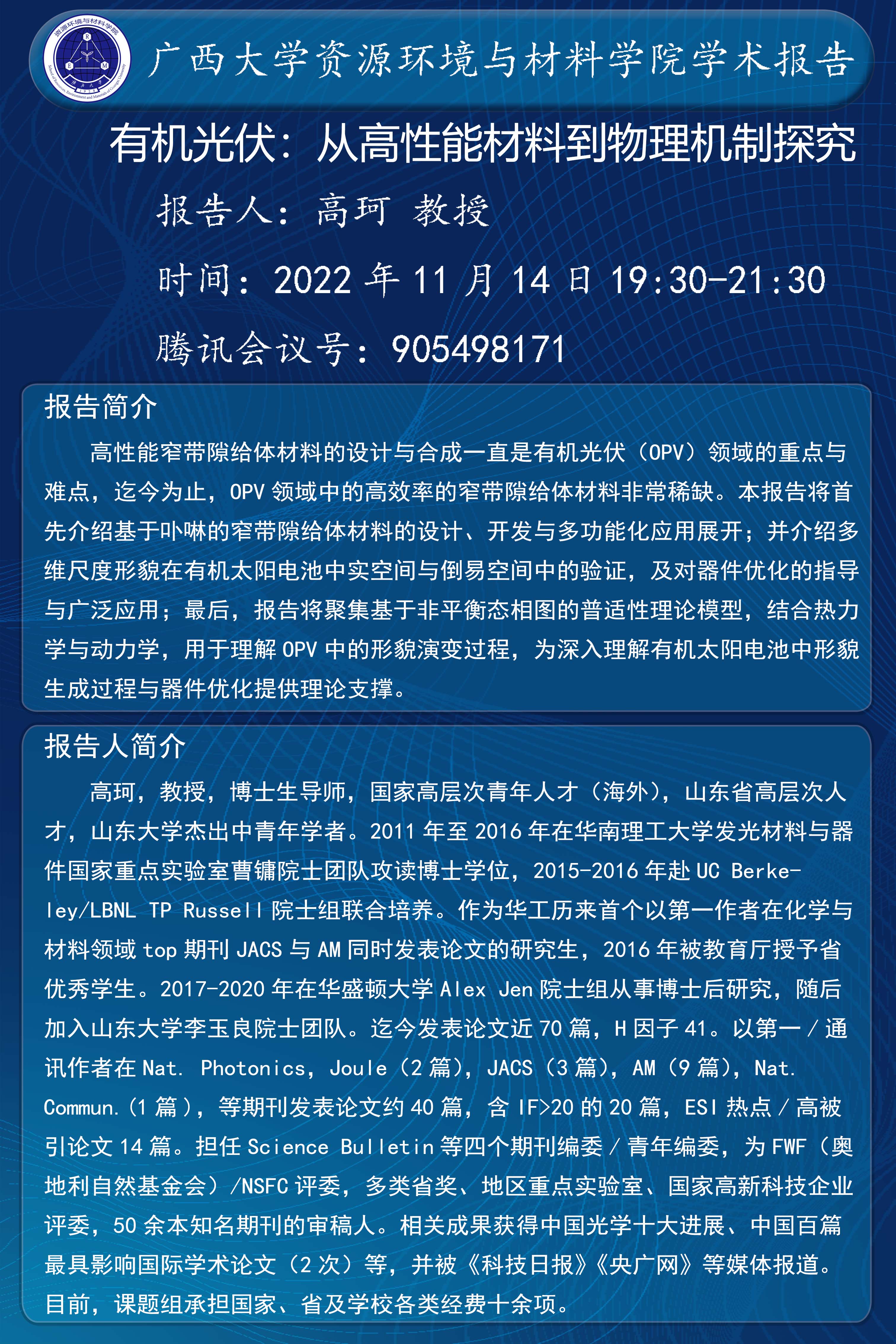 资源环境与材料学院学术报告:有机光伏:从高性能材料到物理机制探究