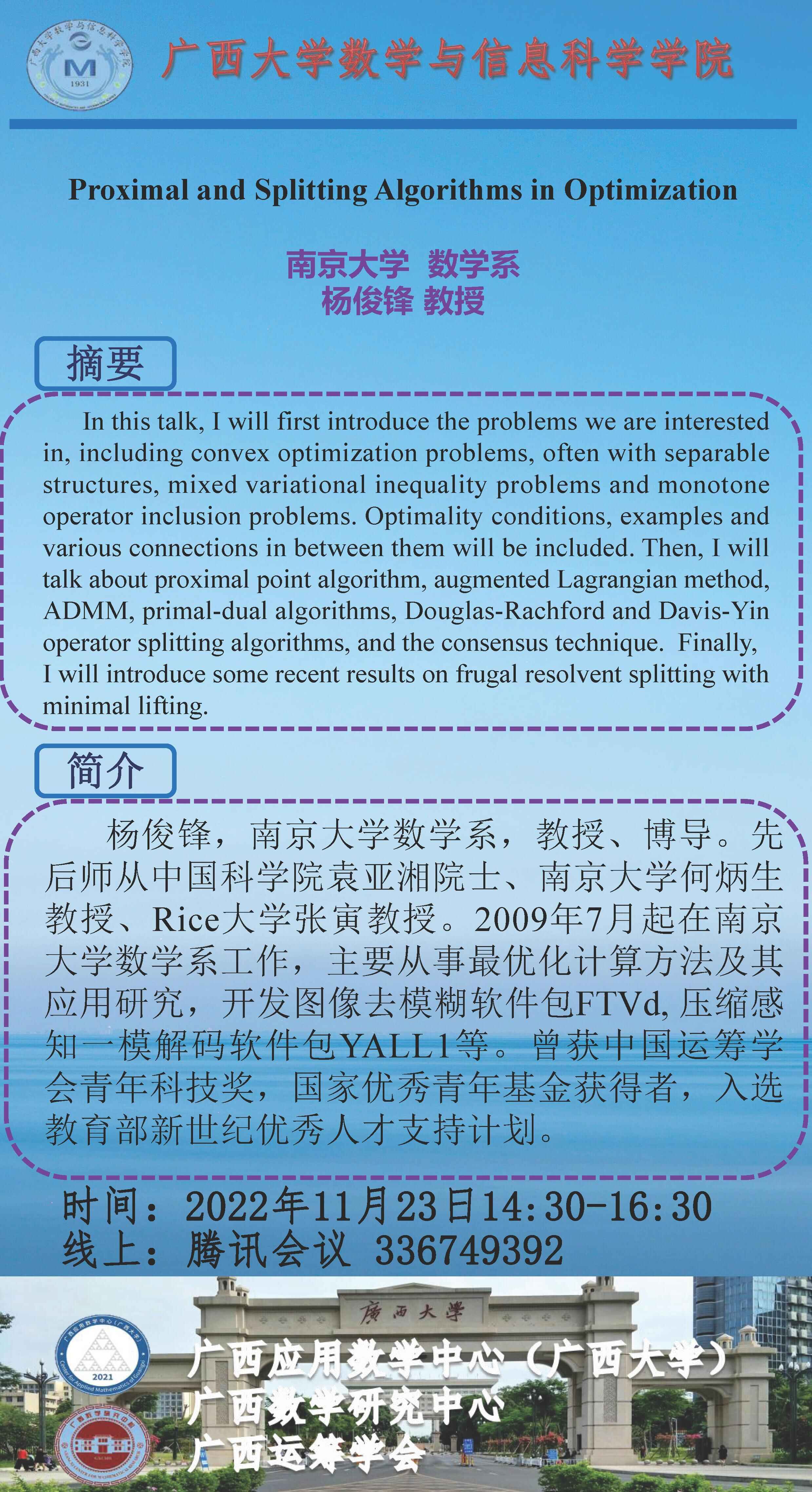 数学与信息科学学院/广西应用数学中心(beat365正版唯一官方网站)学术报告Proximal and Splitting Algorithms in Optimization