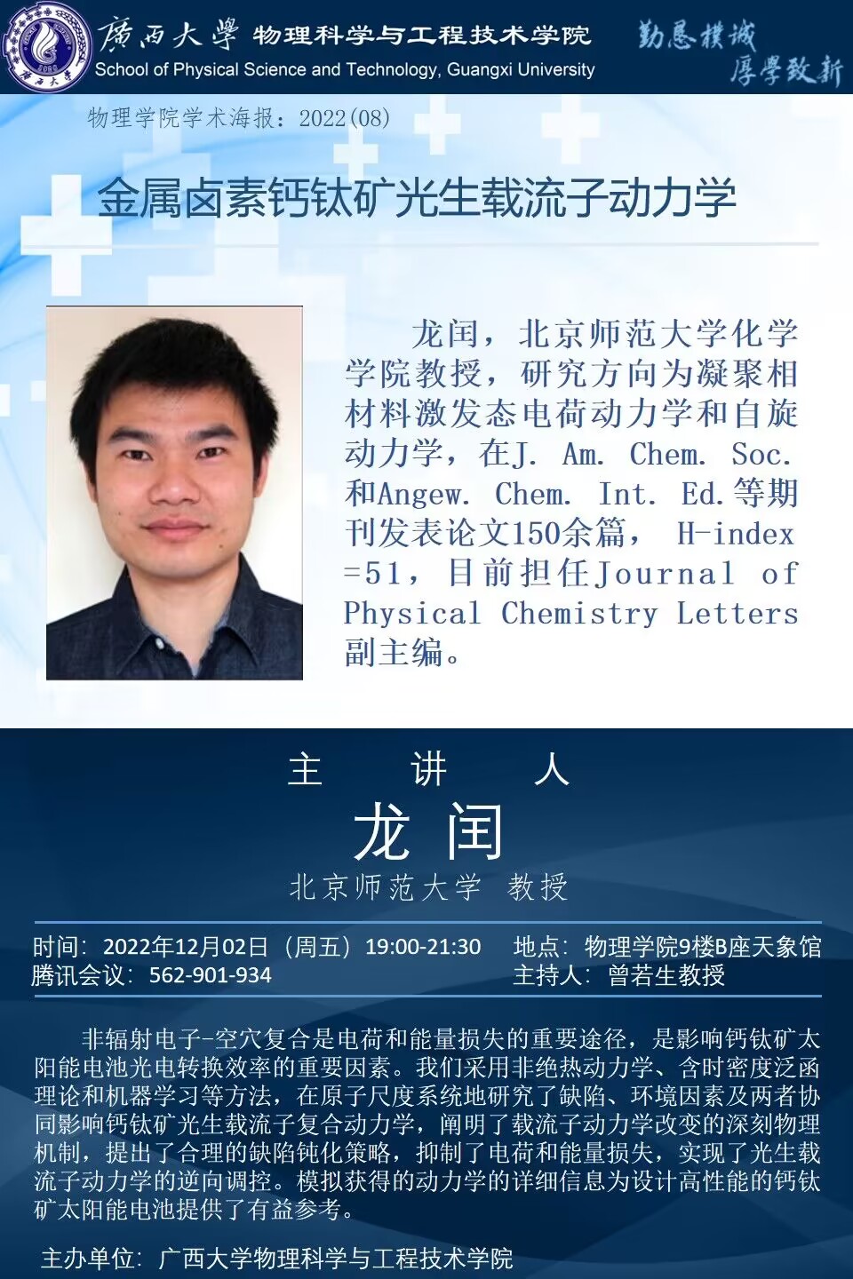 主讲人 龙闰 教授 地址 物理学院9楼B座天象馆