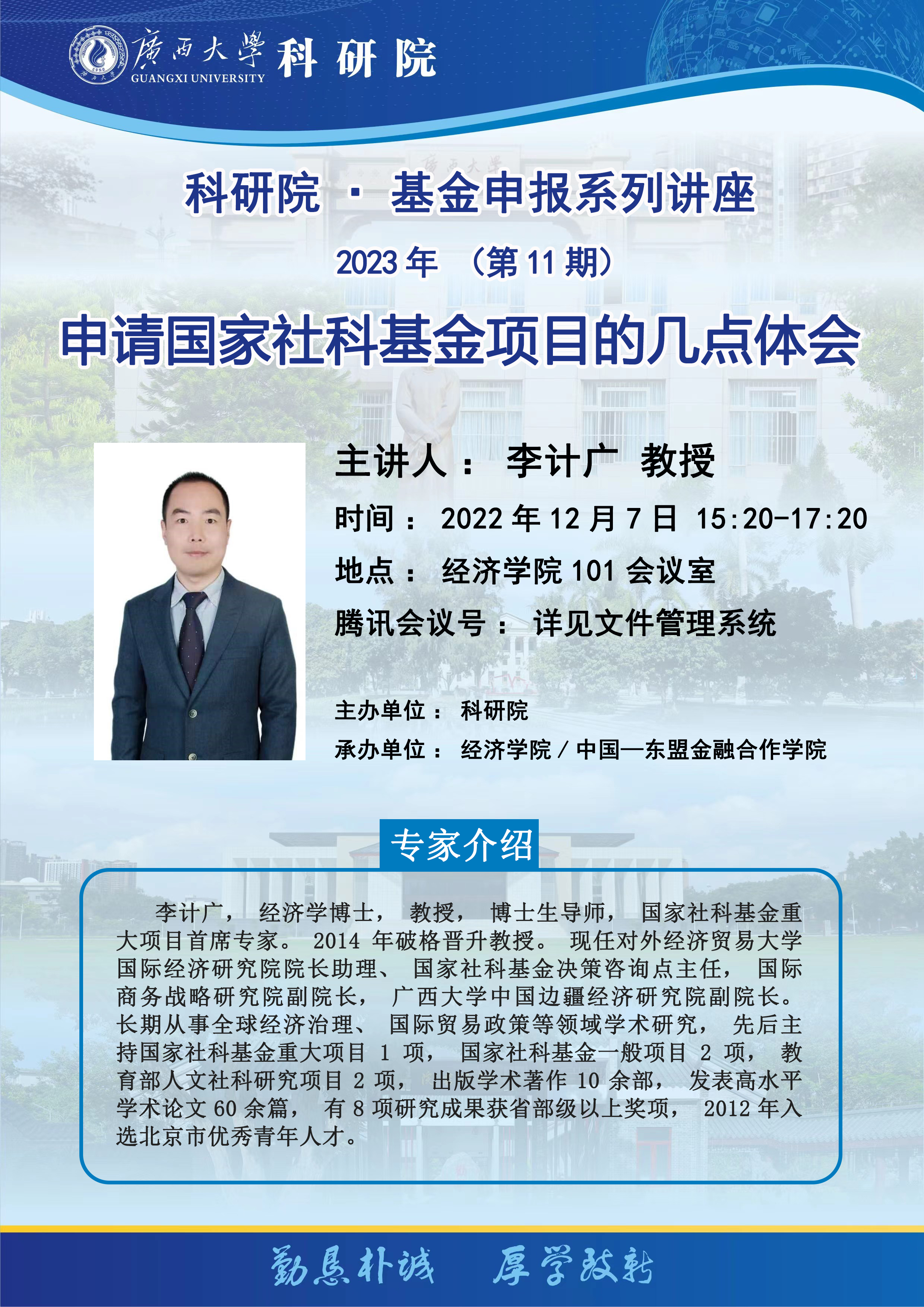 科研院·基金申报系列讲座 2023年(第11期)申请国家社科基金项目的几点体会