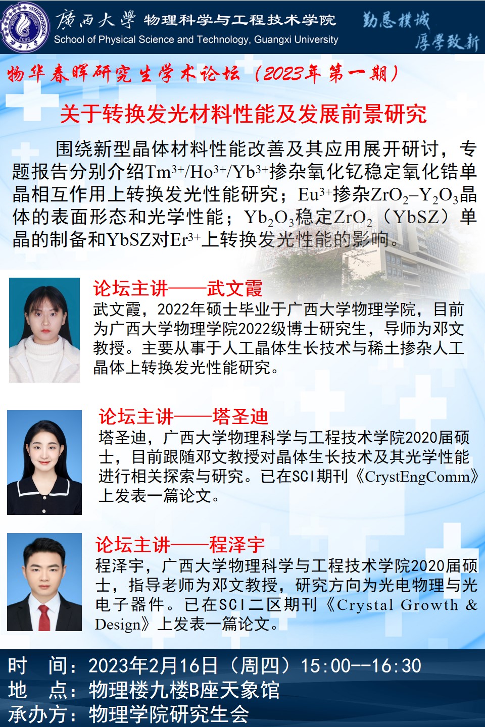 上一条:物理学院2023年星海物语学术论坛(第二期):黑洞、双星在高能波段及时域光变领域研究进展的讨论和展望