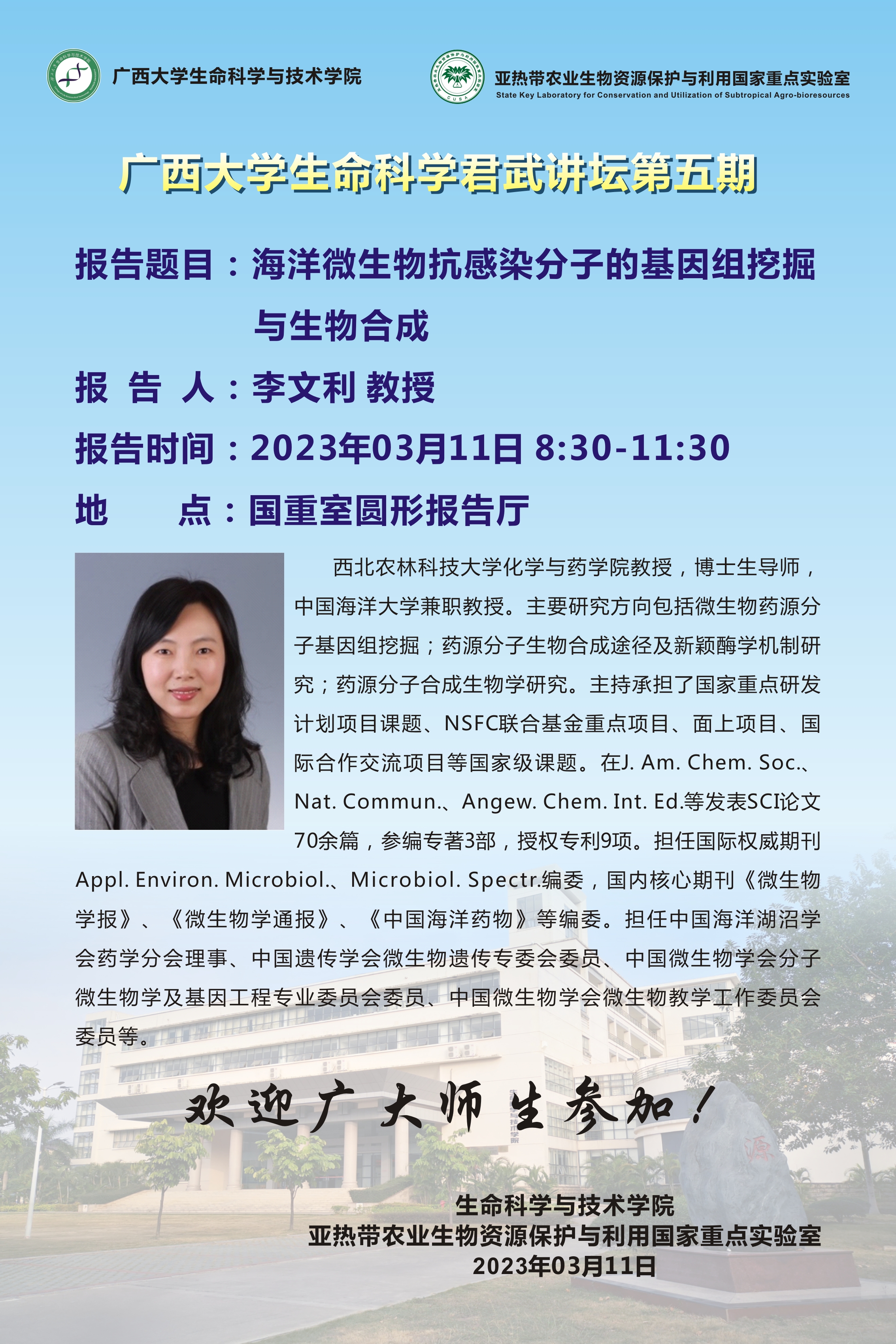 生命科学君武讲坛(第五期):海洋微生物抗感染分子的基因组挖掘与生物合成